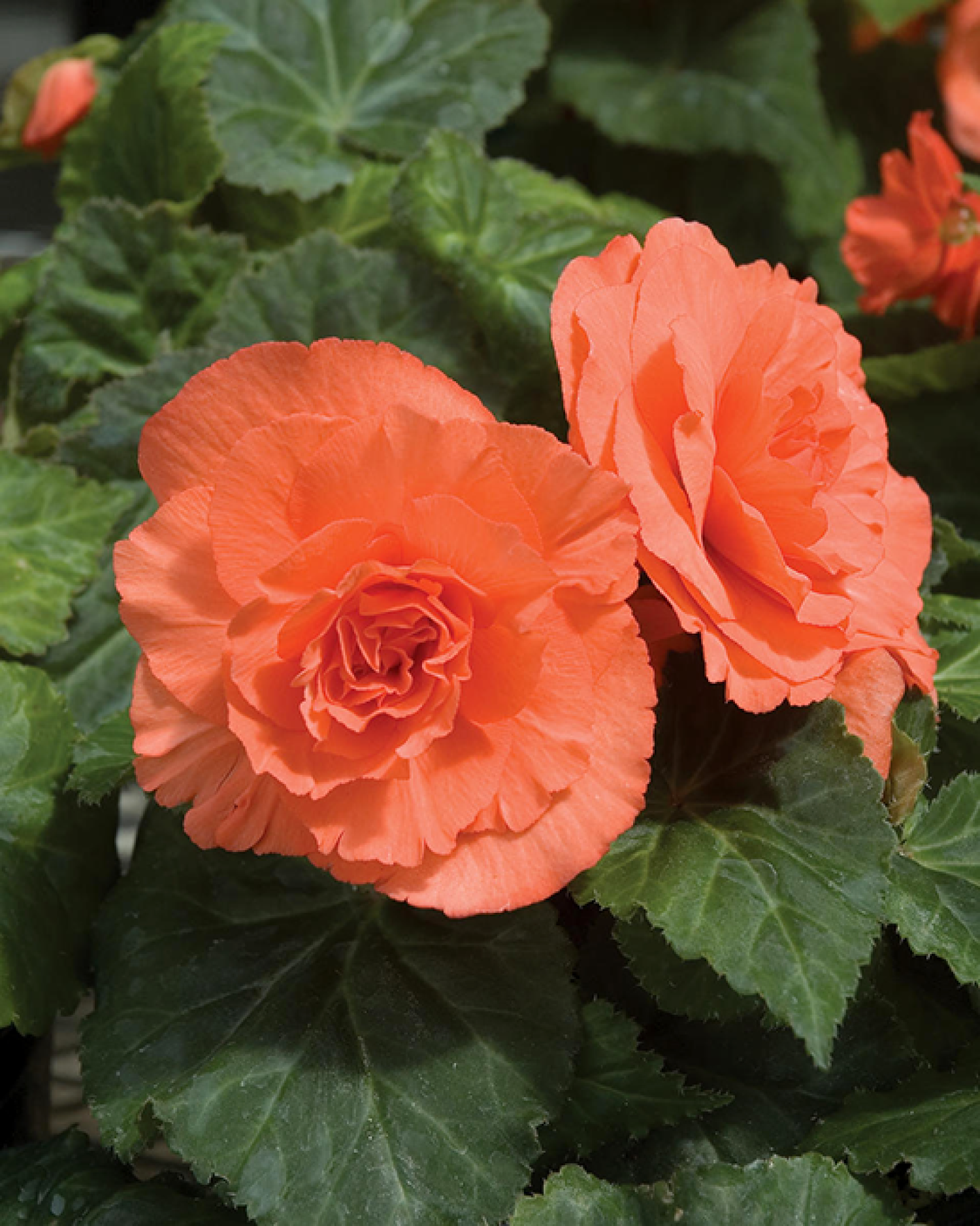 🌺 Бегонія Double Salmon — ніжний та надзвичайно декоративний сорт бульбової бегонії з великими густомахровими квітками лососево-рожевого відтінку. Квіти мають пишну, трояндоподібну форму, виглядають дуже витончено й створюють м’який акцент у квітниках та контейнерних композиціях. Цвітіння рясне та тривале — з початку літа й до осені.