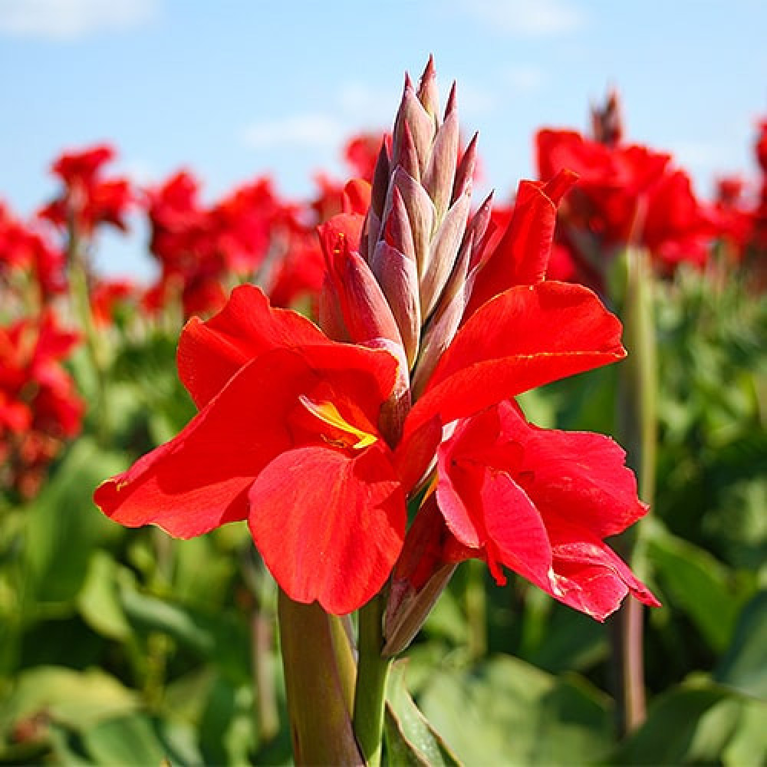 Канна Brilliant — яскравий декоративний сорт із великими, насичено-червоними квітами, які зібрані у високі ефектні суцвіття. Рослина відзначається потужним ростом і виразним екзотичним виглядом, завдяки чому часто використовується як центральний акцент у квітниках. Листя велике, декоративне, зелене або з легким бронзовим відтінком, щільне й широке. Висота дорослої рослини сягає 120–150 см. Цвітіння тривале — з початку літа й до перших заморозків. Канна Brilliant чудово підходить для відкритого ґрунту, міксбордерів, паркових композицій та контейнерного вирощування, а також добре виглядає в групових посадках.
