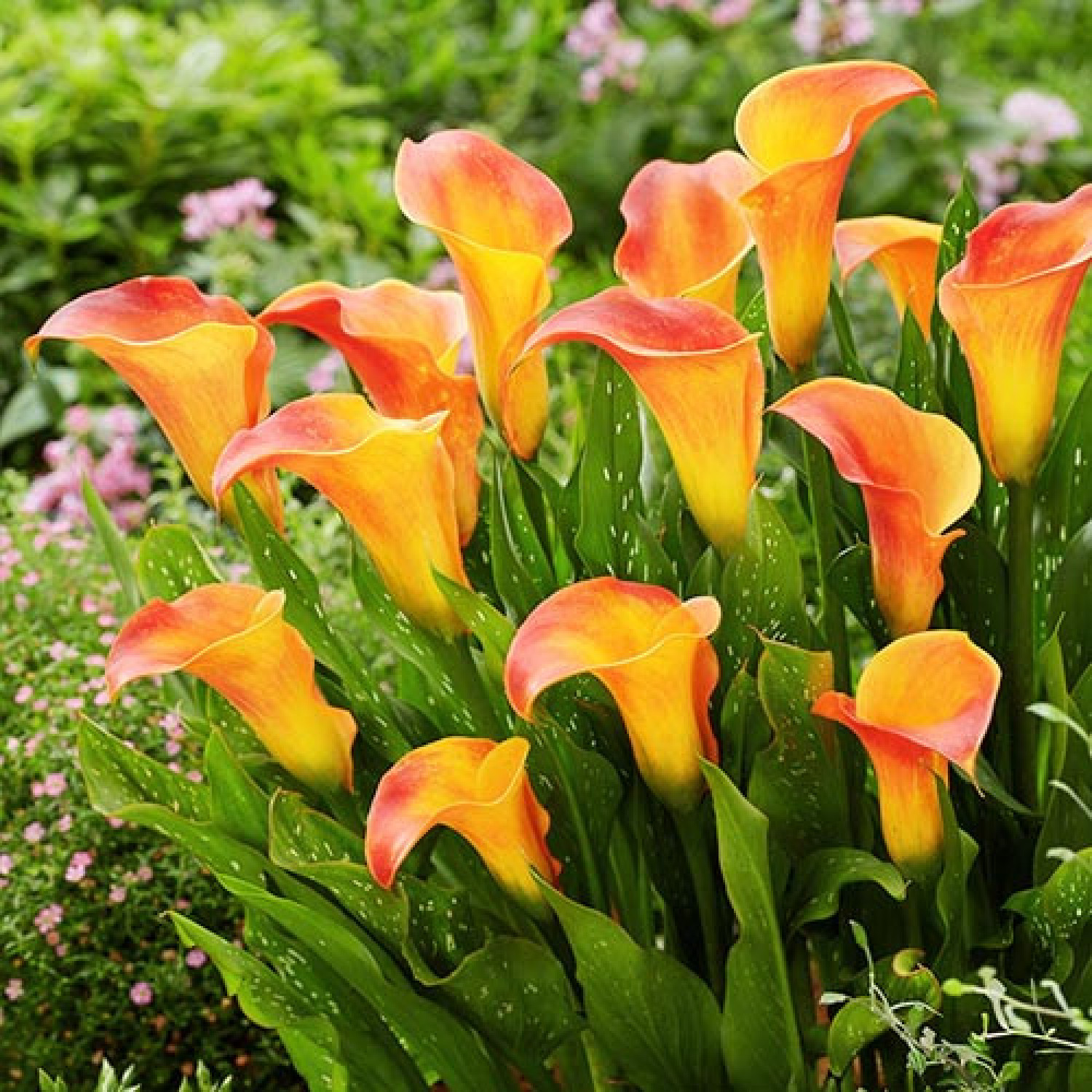 Калла Royal Pumpkin — надзвичайно яскравий та рідкісний сорт із теплим гарбузово-помаранчевим забарвленням покривала, що одразу привертає увагу 🌺. Квітка велика, келихоподібної форми, з насиченим кольором і легким глянцевим блиском, виглядає дуже ефектно як у садових композиціях, так і в контейнерному вирощуванні. Кущ компактний, акуратний, шириною близько 30–40 см. Квітконоси міцні, прямостоячі, досягають висоти 65–75 см, чудово підходять для зрізу. Листя темно-зелене, щільне, шкірясте, часто з декоративними світлими цятками. Цвітіння рясне та тривале — з початку літа і майже до осені. Калла Royal Pumpkin стане яскравим акцентом клумби та прикрасою будь-якої флористичної композиції.