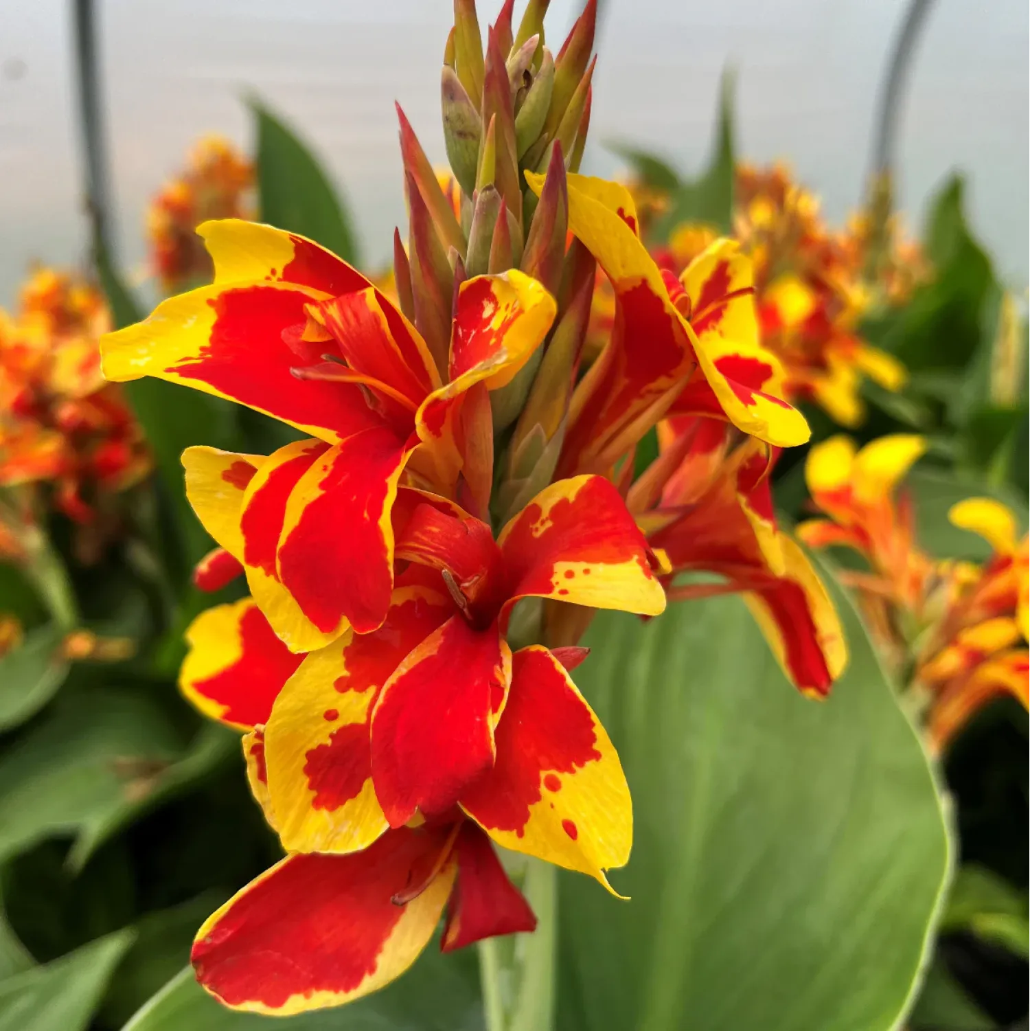 🌺  Канна Golden Flame — надзвичайно яскравий декоративний сорт із ефектними двоколірними квітами. Пелюстки поєднують насичений жовтий колір з помаранчево-червоними язиками полум’я, що повністю виправдовує назву сорту. Рослина формує потужний кущ із великим зеленим листям, зберігаючи декоративність протягом усього сезону. Цвітіння рясне й тривале — з початку літа до осені. Канна Golden Flame чудово підходить для клумб, солітерних посадок і створення яскравих акцентів у саду.
