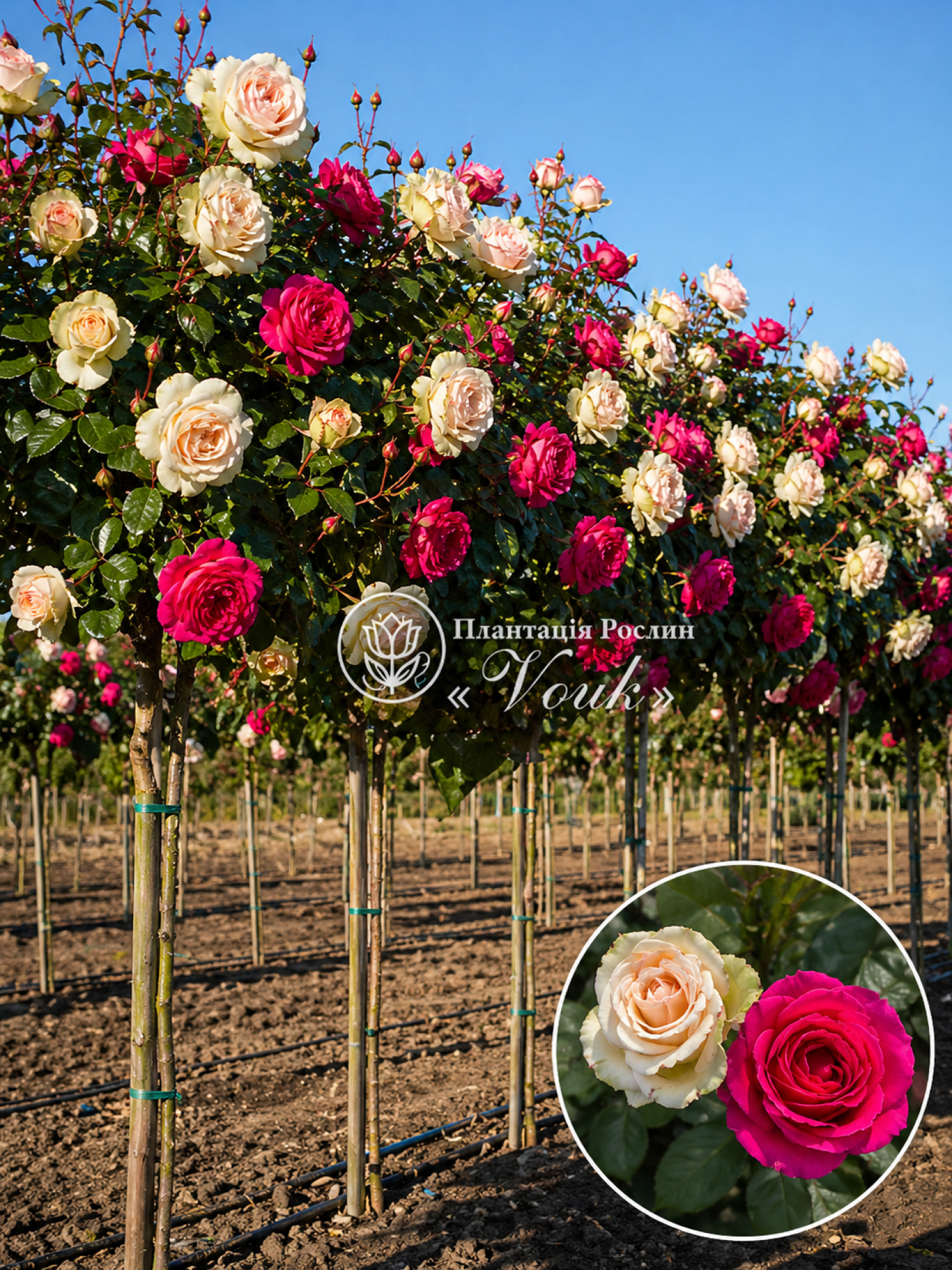 Поєднання кремово-білих та яскраво-рожевих відтінків робить цей штамб особливо ефектним, романтичним та виразним. Цвітіння повторне, рясне та тривале протягом усього сезону. Квіти добре переносять дощ, довго зберігають декоративність та чудово підходять для зрізу.