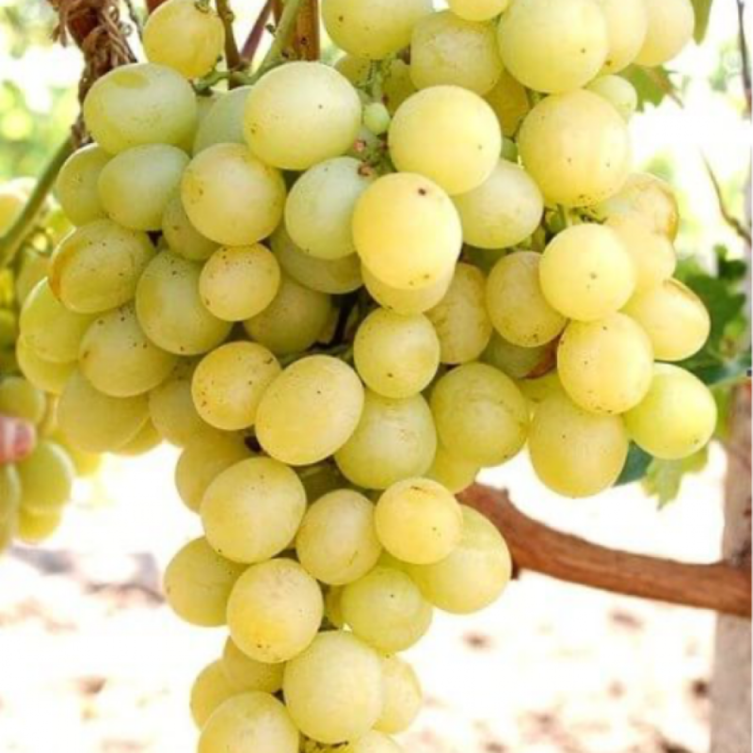 🍇Виноград Талісман — це легендарний столовий сорт середньо-раннього терміну дозрівання (125–135 днів), який став основою для багатьох сучасних гібридів. Сорт вражає своїми гігантськими гронами середньої щільності, вага яких зазвичай становить 800–1200 грамів, а при належному догляді може сягати 2 кілограмів і більше. Ягоди дуже великі, масою 12–16 грамів, мають округло-овальну форму та привабливий біло-кремовий колір із сонячною засмагою.