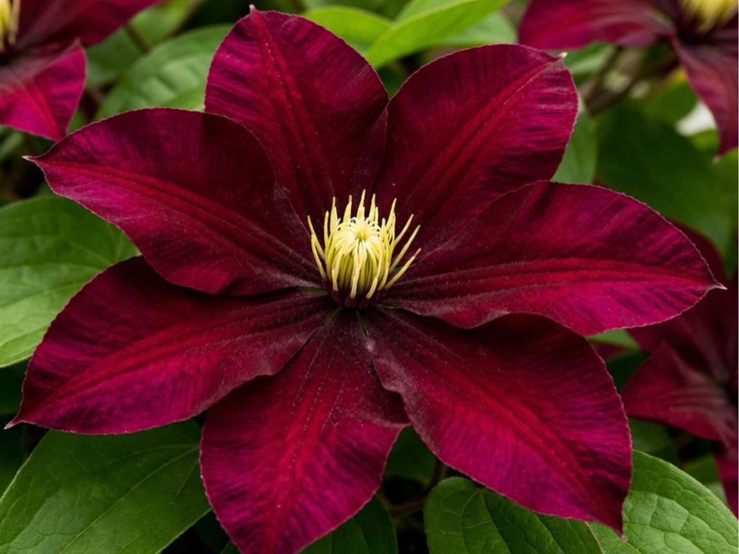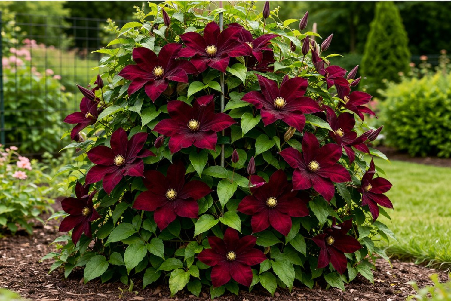 🌸 Клематис Niobe — один из самых эффектных сортов крупноцветковых клематисов с глубоким, насыщенным окрасом цветков. Его главная особенность — крупные бархатистые цветы тёмно-бордового, почти чёрного оттенка, которые особенно выразительно смотрятся на фоне ярко-жёлтых тычинок. Цветок простой, состоит из 6–8 широких, слегка заострённых лепестков с бархатной текстурой. 🌱 Лиана отличается сильным ростом и достигает высоты 2–2,5 метра, что делает её идеальной для вертикального озеленения арок, пергол, заборов и стен.
