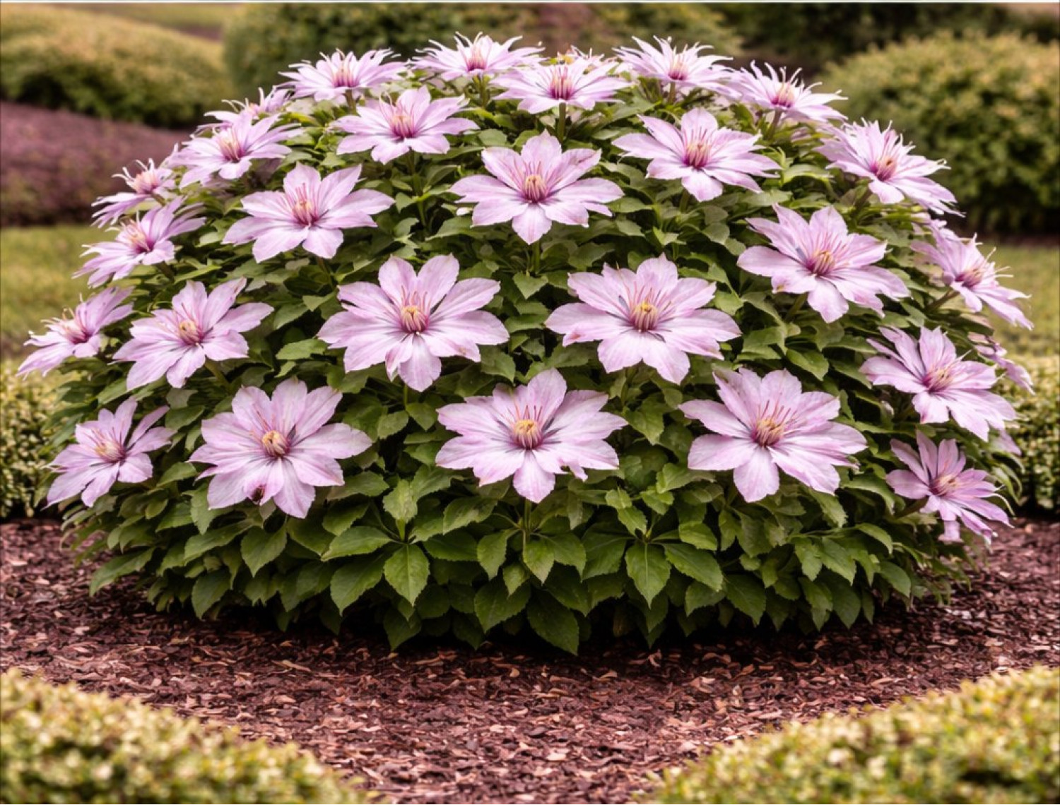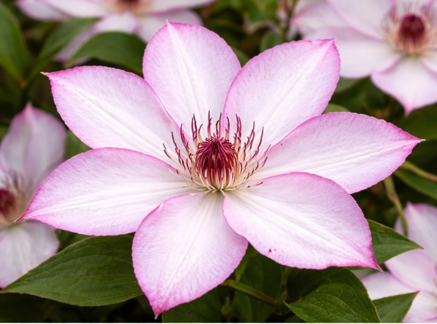 🌸 Клематис Omoshiro — изящный японский сорт крупноцветкового клематиса, отличающийся нежной и утончённой окраской цветков. Основной цвет лепестков светло-розовый или почти белый, с тонкой розово-лавандовой каймой по краю, которая с возрастом цветка становится более выраженной. Цветок простой, состоит из 6–8 широких, слегка волнистых лепестков с кремово-жёлтыми тычинками, придающими ему лёгкость и элегантность. 🌱 Лиана обладает умеренной силой роста и достигает высоты 2–3 метра, отлично подходит для вертикального озеленения арок, пергол, шпалер и декоративных опор.