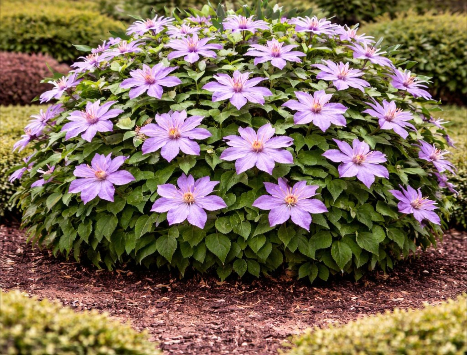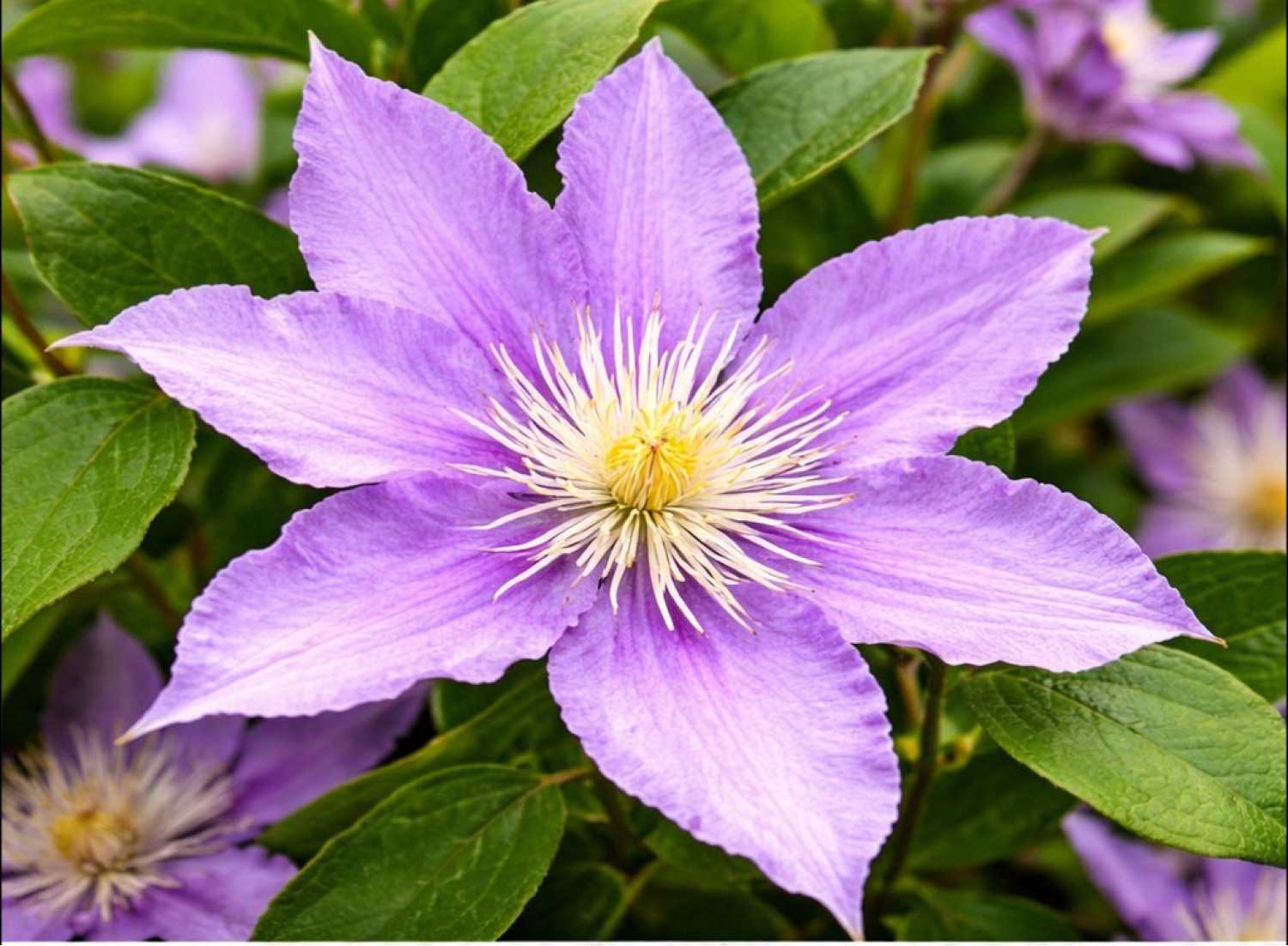 🌸 Клематис Palette — изысканный крупноцветковый сорт с нежной пастельной окраской, благодаря которой и получил своё название. Цветки светло-лиловые или розово-лавандовые, с более насыщенной фиолетово-пурпурной каймой по краю лепестков. В центре располагаются контрастные кремово-жёлтые тычинки, подчёркивающие декоративность цветка. Цветок простой, состоит из 6–8 широких, слегка волнистых лепестков. 🌱 Лиана обладает умеренной силой роста, достигает высоты 2–2,5 метра и идеально подходит для вертикального озеленения арок, пергол, решёток и стен.