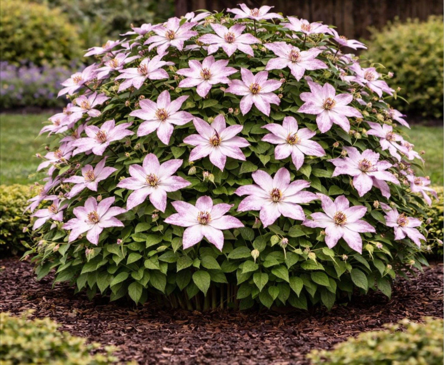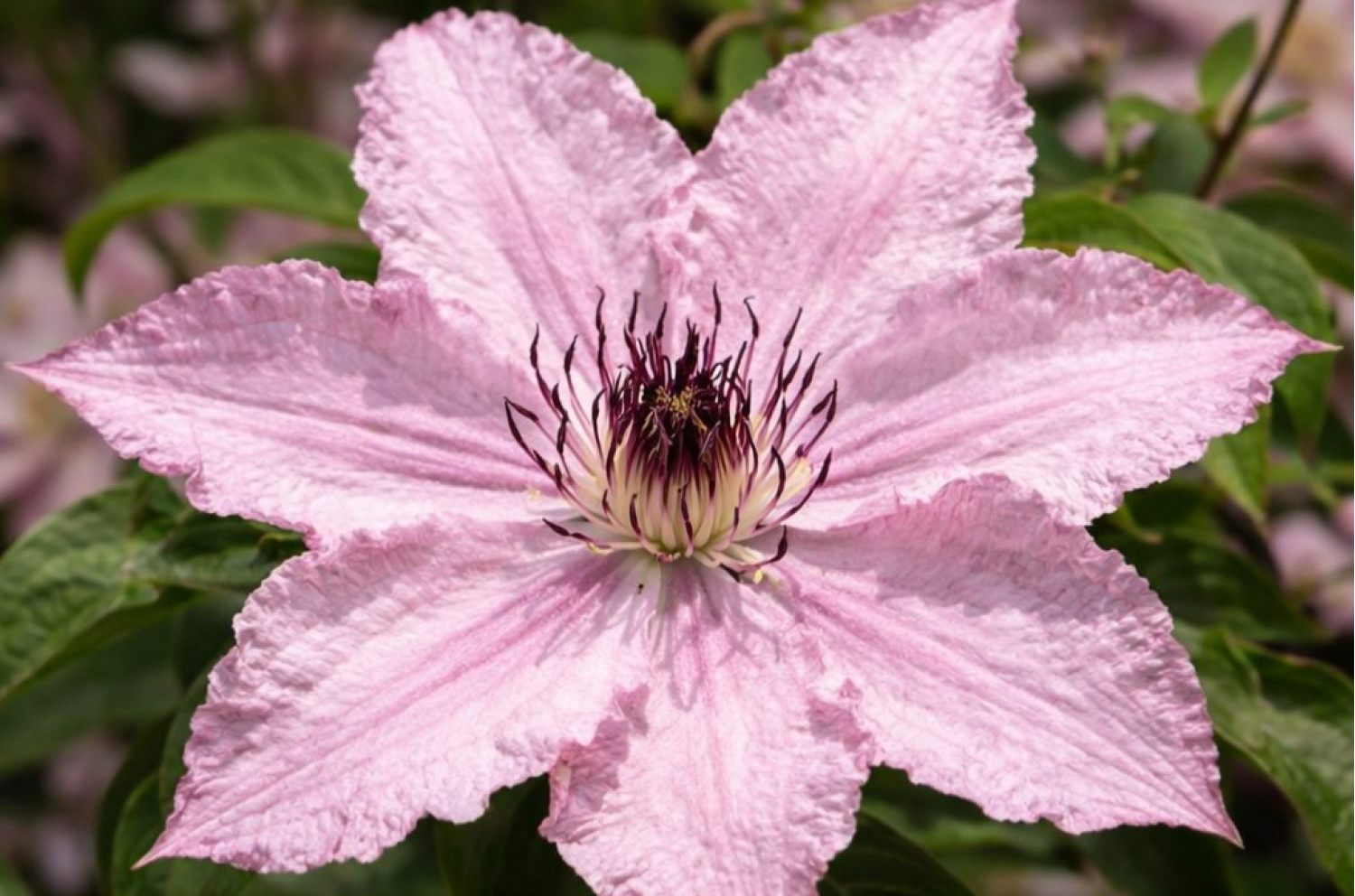 🌸 Клематис Hagley Hybrid — один из самых надежных и любимых сортов во всем мире, который относится к группе крупноцветковых поздних клематисов. Главной особенностью растения являются его необычайно нежные цветы перламутрово-розового или светло-сиреневого цвета с изящными гофрированными краями. По типу цветок простой, состоит из 6 лепестков, которые эффектно контрастируют с яркими шоколадно-пурпурными тычинками в центре. 🌱 Куст обладает умеренной силой роста и достигает высоты 2–3 метра, что делает его идеальным для выращивания у беседок, заборов или небольших садовых опор.