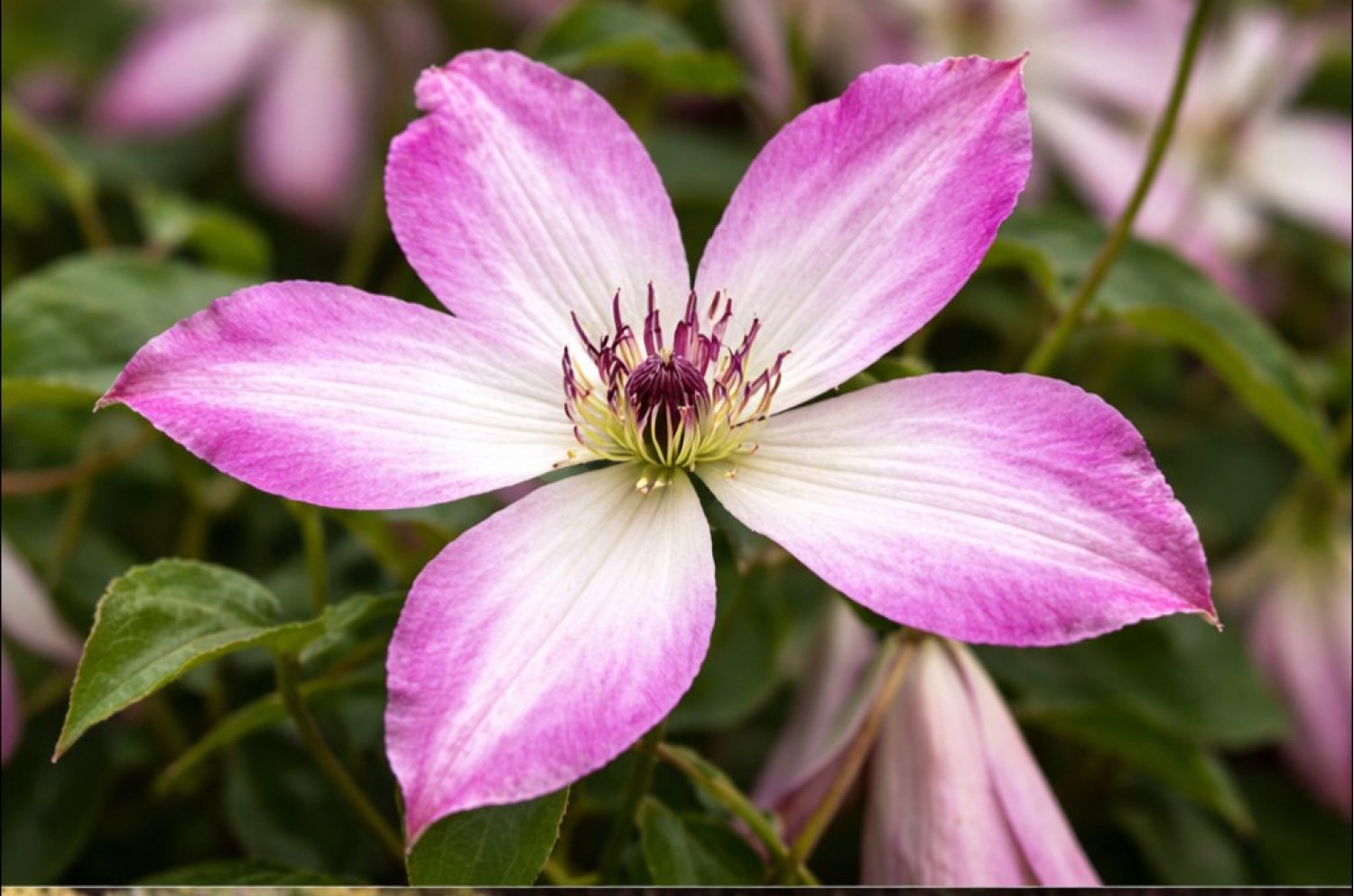 🌸 Клематис I Am Lady Q — это необычайно утонченный сорт голландской селекции, который относится к группе Viticella (фиолетовые). Главной особенностью растения являются его нежные, воздушные цветы, напоминающие фарфоровые колокольчики. По типу цветок простой, состоит из 4 лепестков белого или нежно-кремового цвета с широкой розово-пурпурной каймой и контрастными темными тычинками. 🌱 Куст обладает большой силой роста и достигает высоты 2.5–3 метра, создавая плотную зеленую завесу, усыпанную сотнями изысканных цветов.