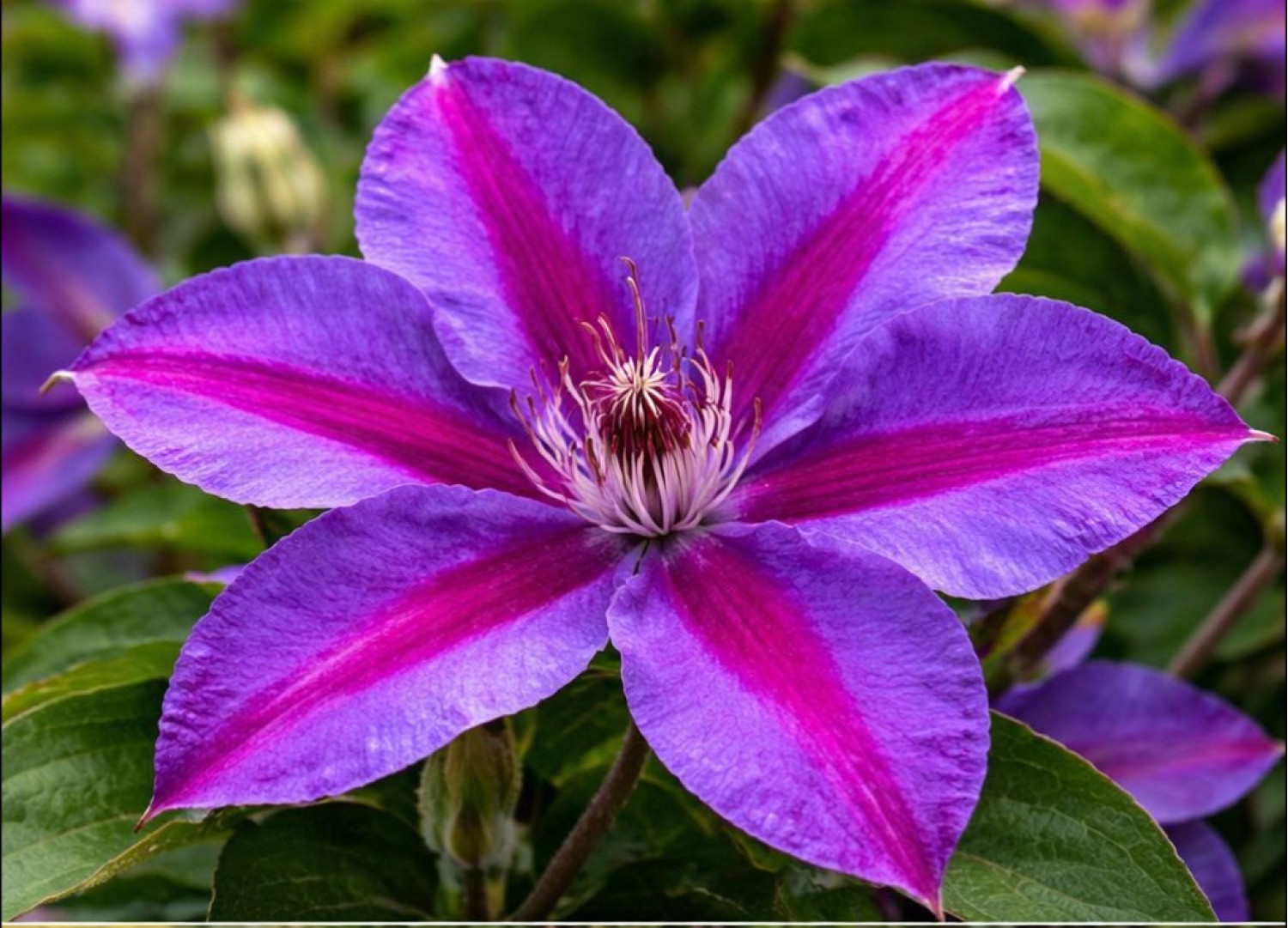 🌸 Клематис Mrs N. Thompson — это необычайно яркий сорт британской селекции, который относится к группе крупноцветковых ранних клематисов. Главной особенностью растения являются его выразительные контрастные цветы: на насыщенном сине-фиолетовом фоне лепестков четко выделяется широкая ярко-пурпурная или малиновая полоса по центру. По типу цветок простой, состоит из 6–8 заостренных лепестков с легким бархатистым блеском и светлыми тычинками, которые придают соцветиям особое изящество. 🌱 Куст компактный, достигает высоты 2–2,5 метра, что делает его идеальным для вертикального озеленения небольших опор, решеток или выращивания в больших садовых вазонах.
