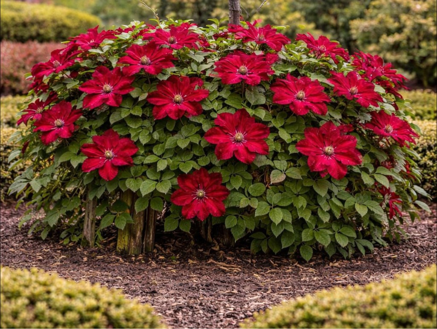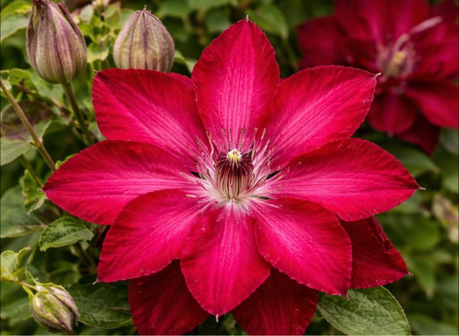 🌸 Клематис Red Passion — это яркий и эффектный сорт крупноцветкового клематиса, привлекающий внимание насыщенной красно-малиновой окраской цветков. Главной особенностью растения являются его крупные, выразительные цветы с бархатистой текстурой лепестков и более тёмной центральной полосой, придающей соцветиям глубину и драматичность. Контрастные светлые тычинки красиво подчёркивают интенсивность окраски. 🌱 Куст обладает хорошей силой роста и достигает высоты 2–3 метров, формируя пышную цветущую лиану.