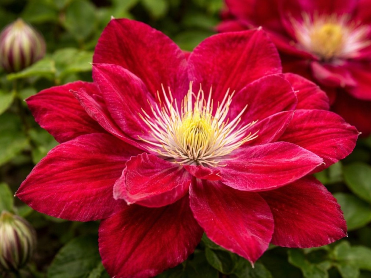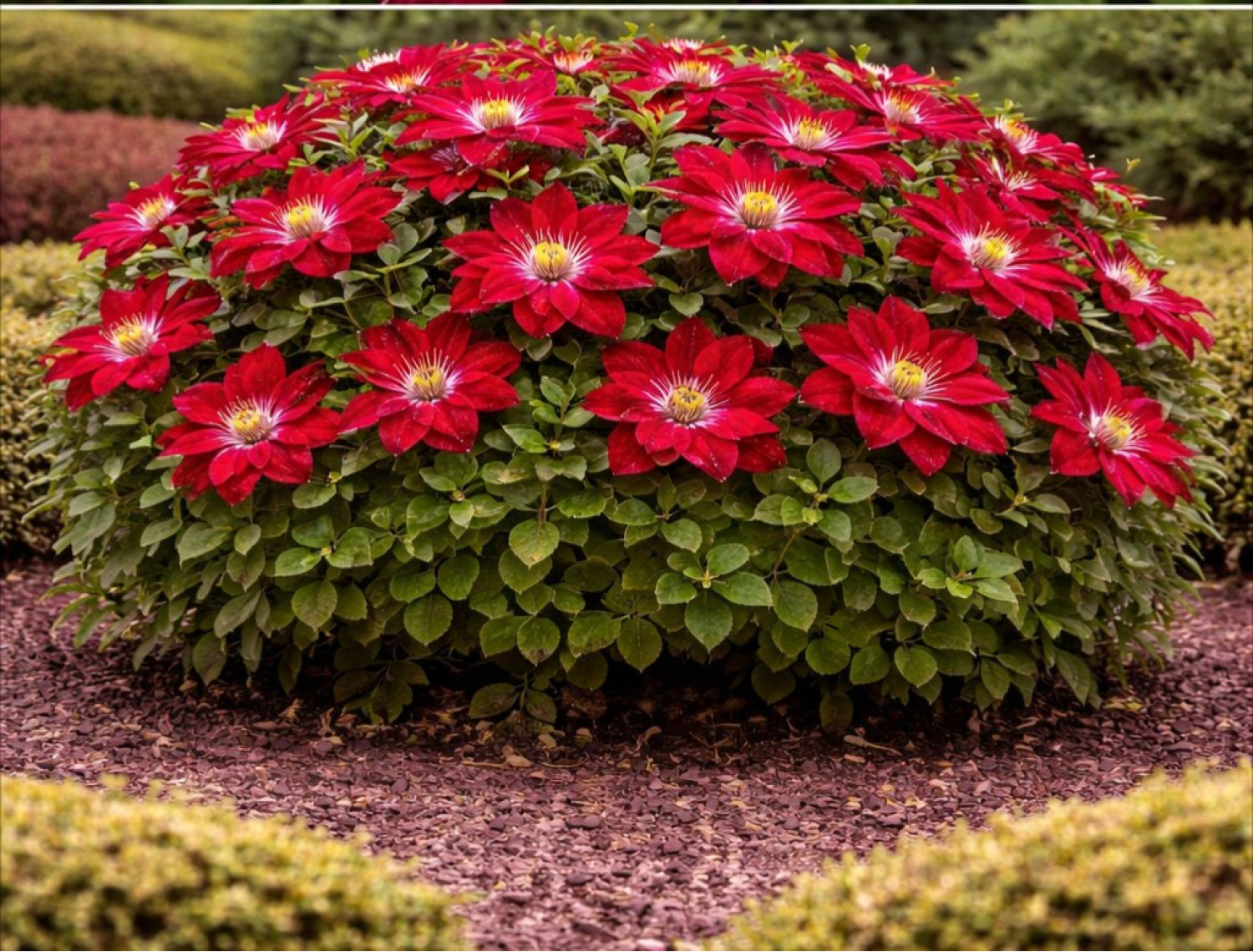 🌸 Клематис Red Star — это роскошный сорт крупноцветкового клематиса японской селекции, поражающий насыщенной красно-малиновой окраской и декоративной формой цветков. Его цветы выглядят объёмными и очень эффектными, с бархатистой текстурой лепестков и глубоким ярким оттенком, который не выгорает на солнце. Контрастные светлые тычинки придают соцветиям выразительность и подчёркивают насыщенность окраски. 🌱 Куст обладает хорошей силой роста и достигает высоты 2–3 метров, формируя пышную, обильно цветущую лиану.