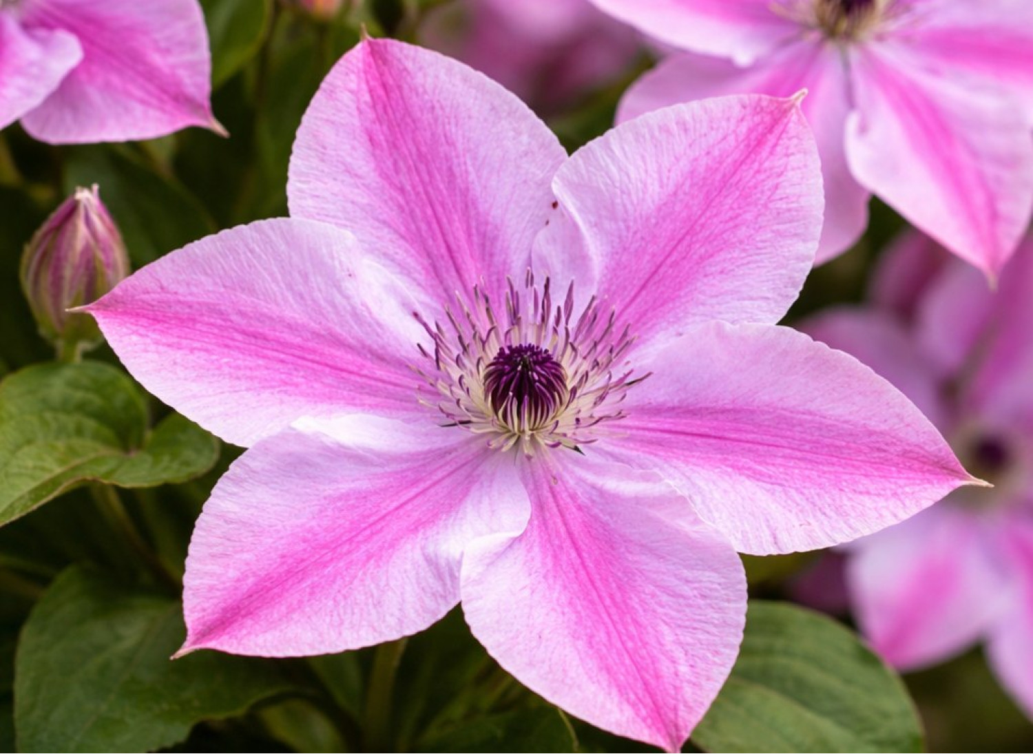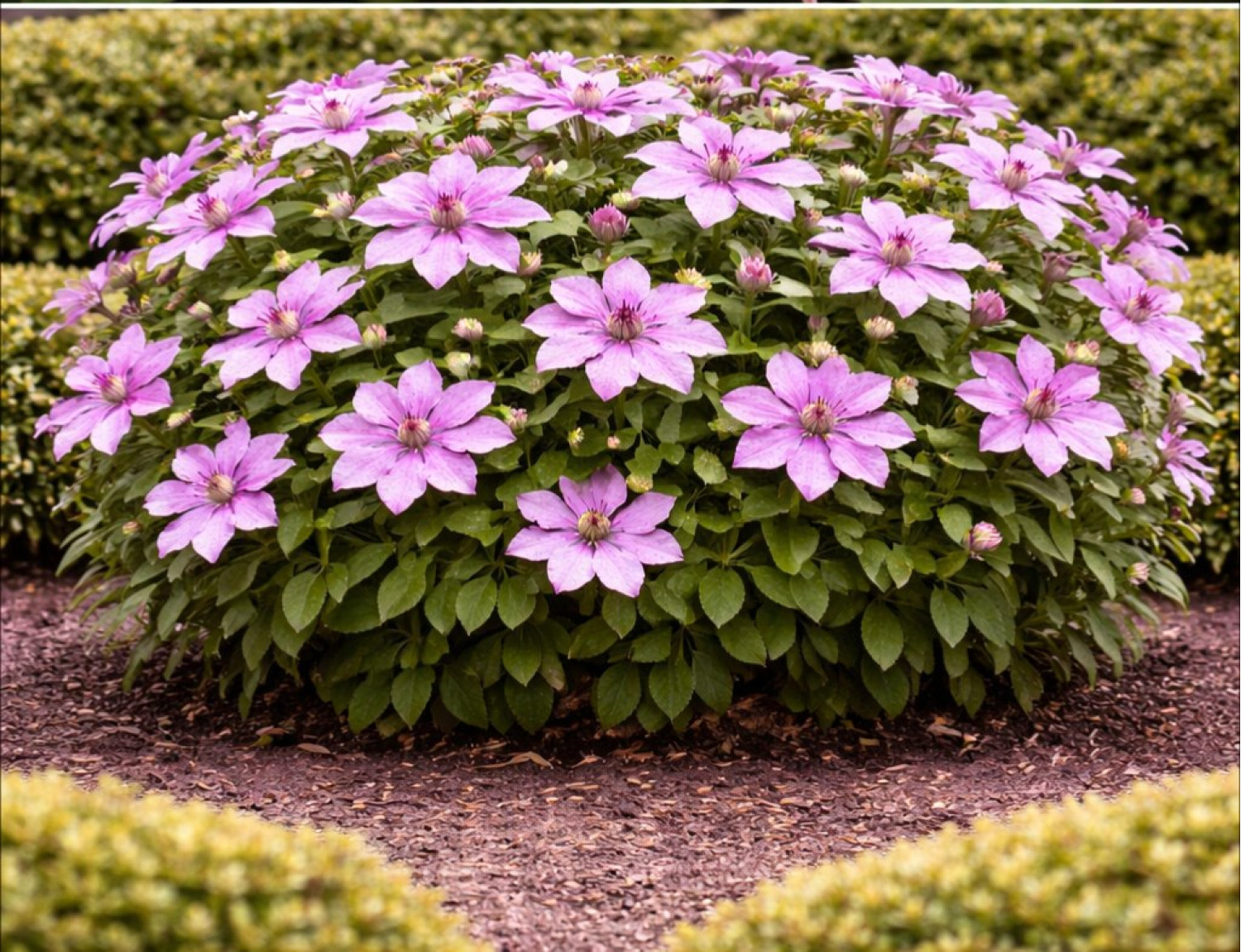 🌸 Клематис Super Cute — это компактный и декоративный сорт крупноцветкового клематиса, отличающийся нежной розово-сиреневой окраской цветков. Его цветы светлые, яркие, с деликатной центральной полосой, придающей соцветиям утончённость и грациозность. Контрастные светлые тычинки подчёркивают красоту окраски и делают цветы более выразительными. 🌱 Куст обладает умеренной силой роста и достигает высоты около 1,5–2 метров, формируя компактную, обильно цветущую лиану, идеально подходящую для небольших садов, балконов и контейнерного выращивания.