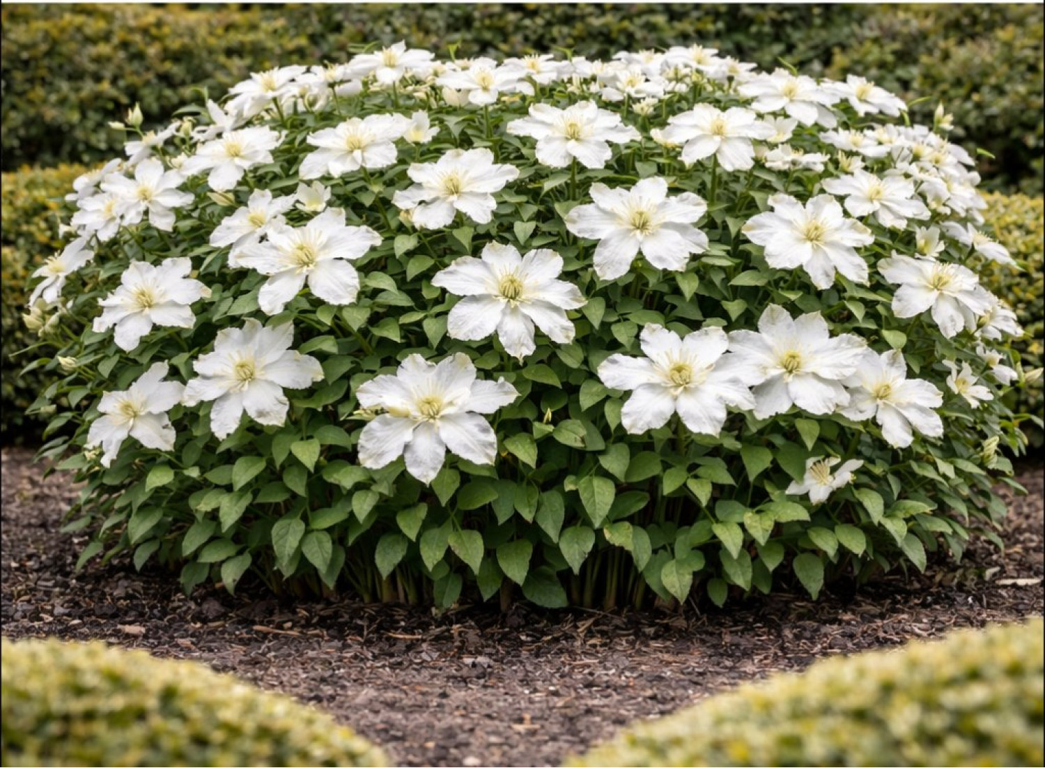 🌸 Клематис White Arabella — это утонченный полутравянистый сорт, который относится к группе Integrifolia (цельнолистные). Главной особенностью растения является его способность цвести необычайно обильно, создавая настоящий водопад из белоснежных цветов. Побеги этого клематиса не цепляются за опоры самостоятельно, поэтому его часто используют в качестве роскошного почвопокровного растения или подвязывают к невысоким решеткам. Цветки по типу простые, звездообразные, с элегантно изогнутыми лепестками и контрастными желтыми тычинками в центре. 🌱 Длина побегов составляет около 1.5–2 метра, что позволяет формировать плотные цветущие подушки или каскады.