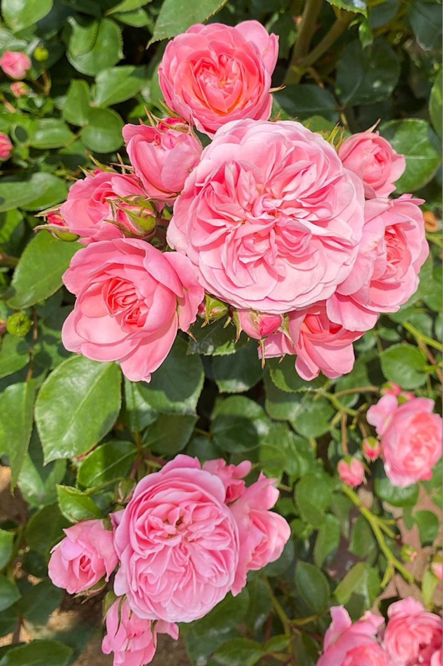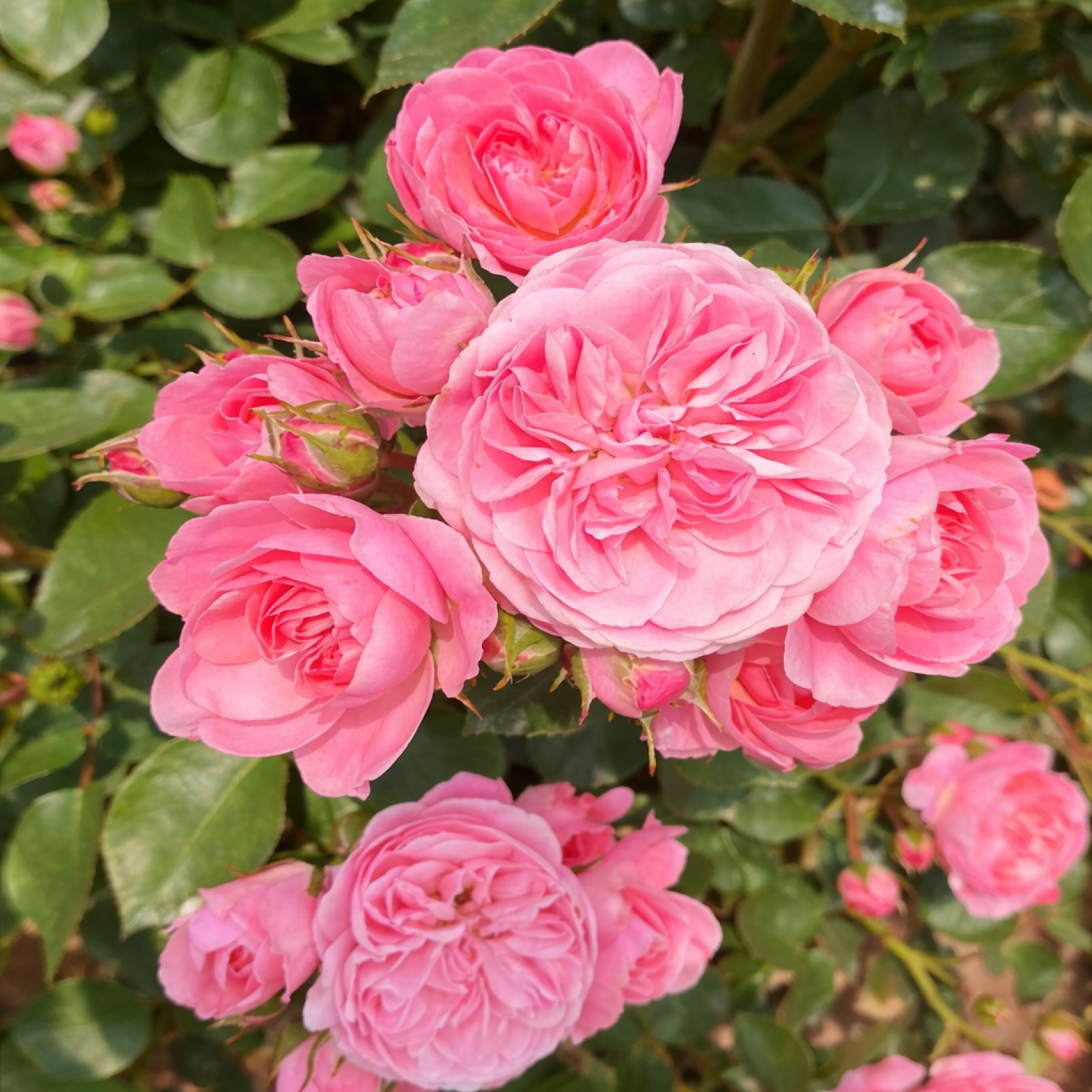 Бутоны очаровательного, теплого, нежно-розового цвета с лососевым оттенком, напоминающие помпоны, махровые, с 50-60 лепестками, диаметром до 8 см, появляются в соцветиях по 5-7 штук. Цветение богатое, непрерывное.