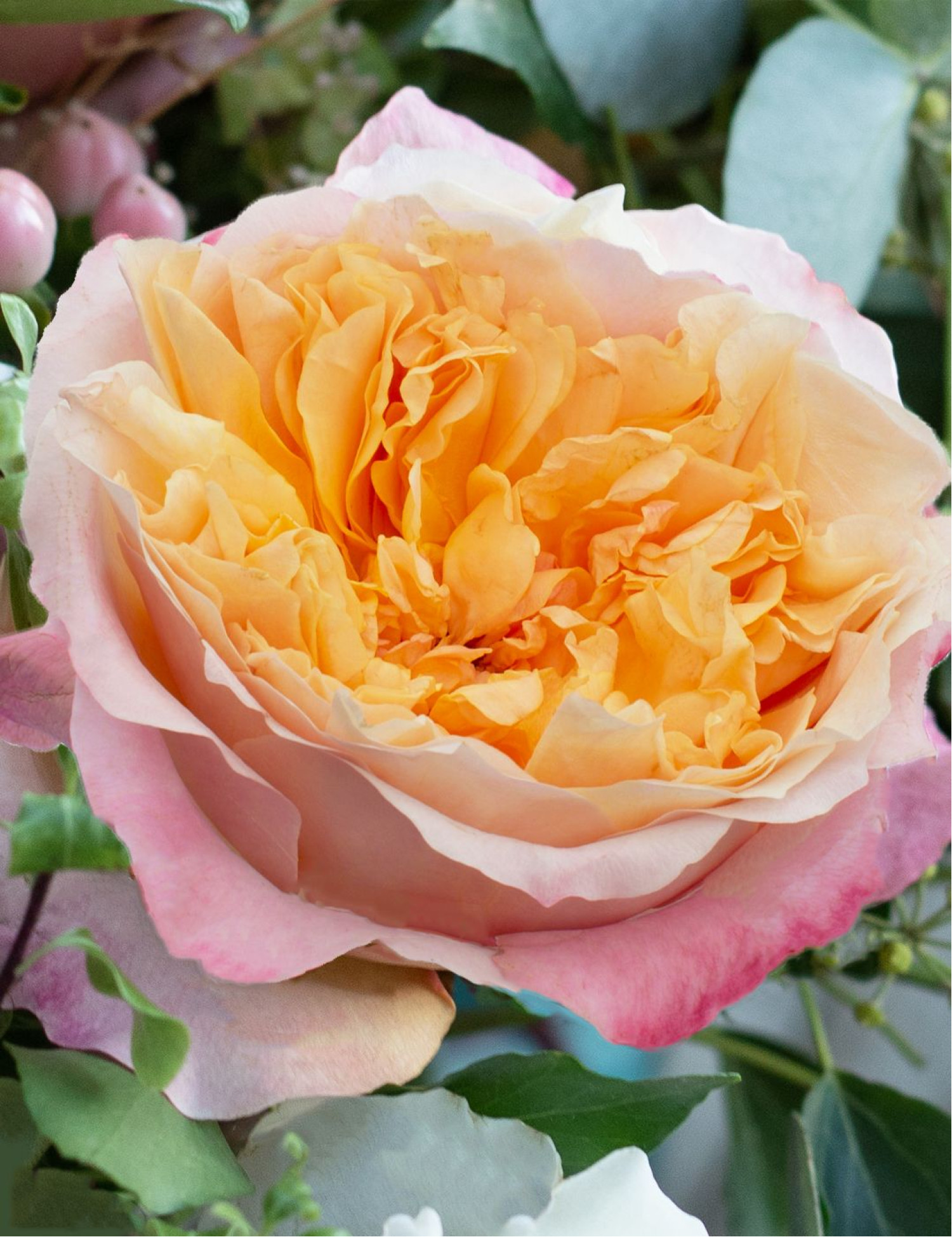 Главная особенность сорта — крупные, густомахровые цветки диаметром 10–15 см с элегантной чашевидной розеточной формой. Окраска уникальна и напоминает летний закат: центр бутона переливается оттенками абрикоса, старого золота и жёлтого цвета, тогда как внешние лепестки образуют нежный ореол розовых или лососёвых тонов, создавая впечатляющий контраст.