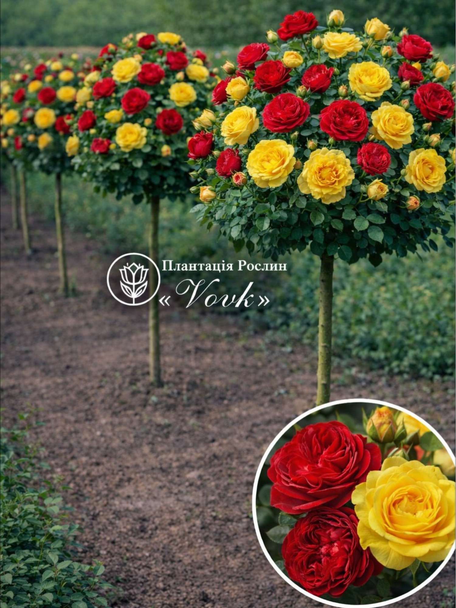 🌱 Вместе эти два сорта выглядят невероятно эффектно: красная глубина Торнадо в сочетании с жизнерадостным жёлтым тоном Жёлтой Куклы создаёт впечатление праздничного фейерверка. Крона штамба обильно цветущая, контрастная, идеально подходит для акцентов в саду, у входа, на газонах или в декоративных композициях. Мы являемся производителем саженцев, поэтому гарантируем сильную корневую систему и отличную адаптацию каждого растения.