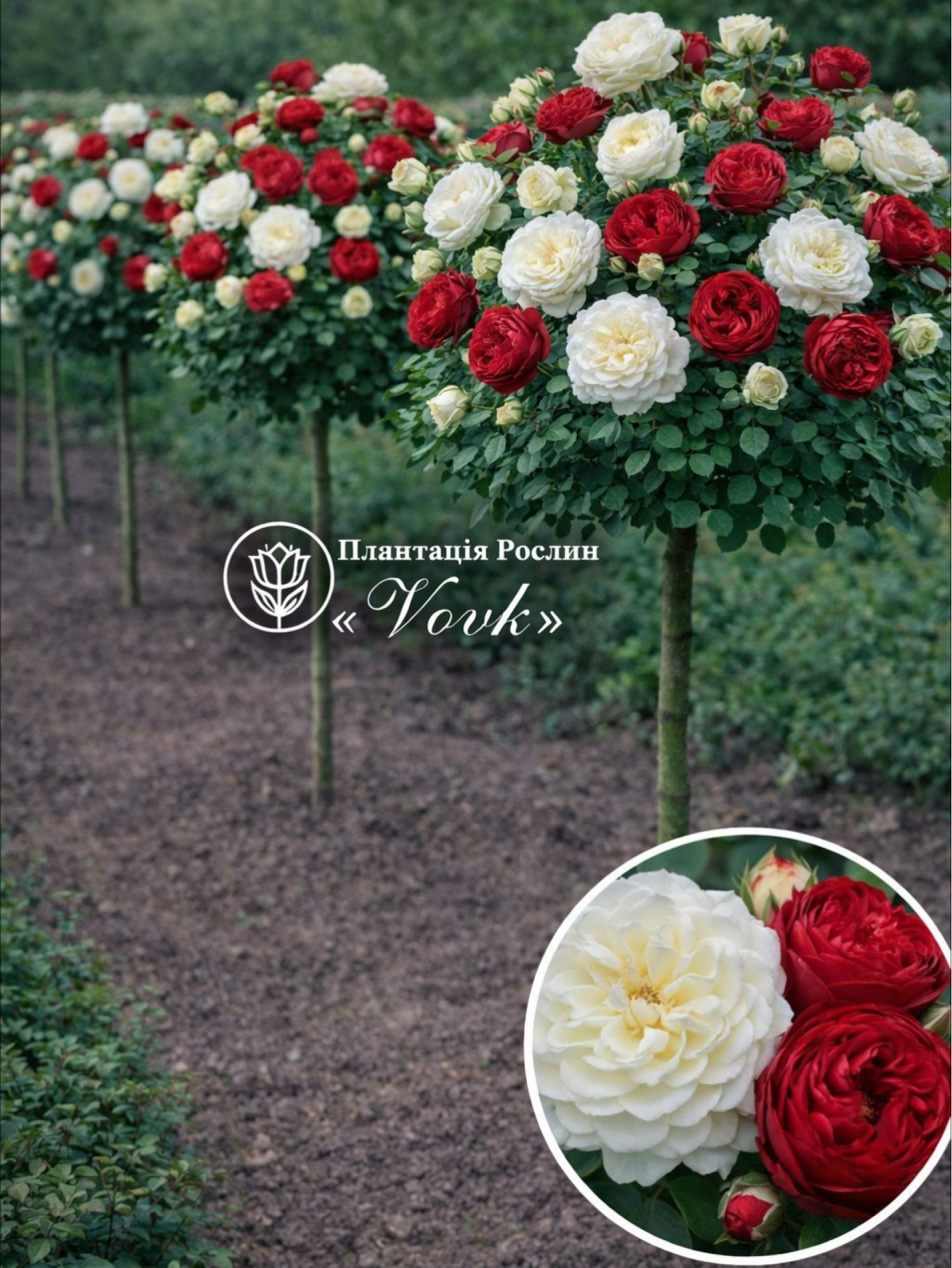 🌱 Сочетание этих двух сортов создаёт неповторимый контраст — чистая гармония белой нежности и страстной красной глубины. Крона штамба распределена равномерно, выглядит эффектно в любой локации: в цветнике, у входа, на газоне или в композициях с многолетниками. Мы являемся производителем саженцев, поэтому гарантируем сильную корневую систему, здоровые побеги и отличную адаптацию растений к климату Украины.