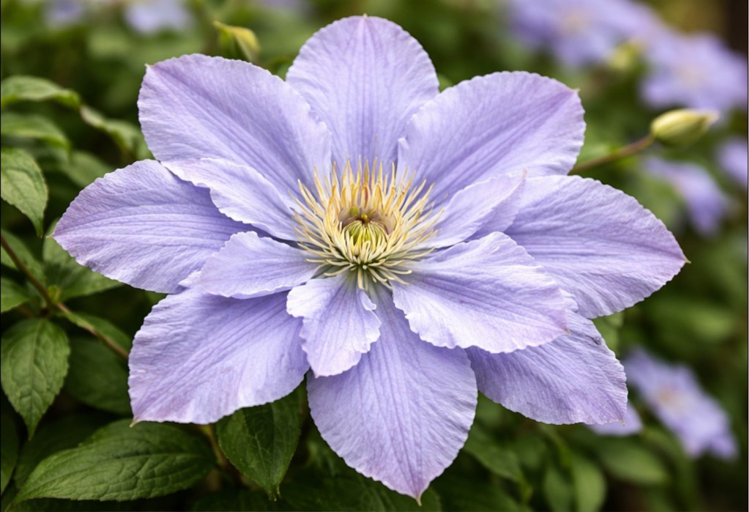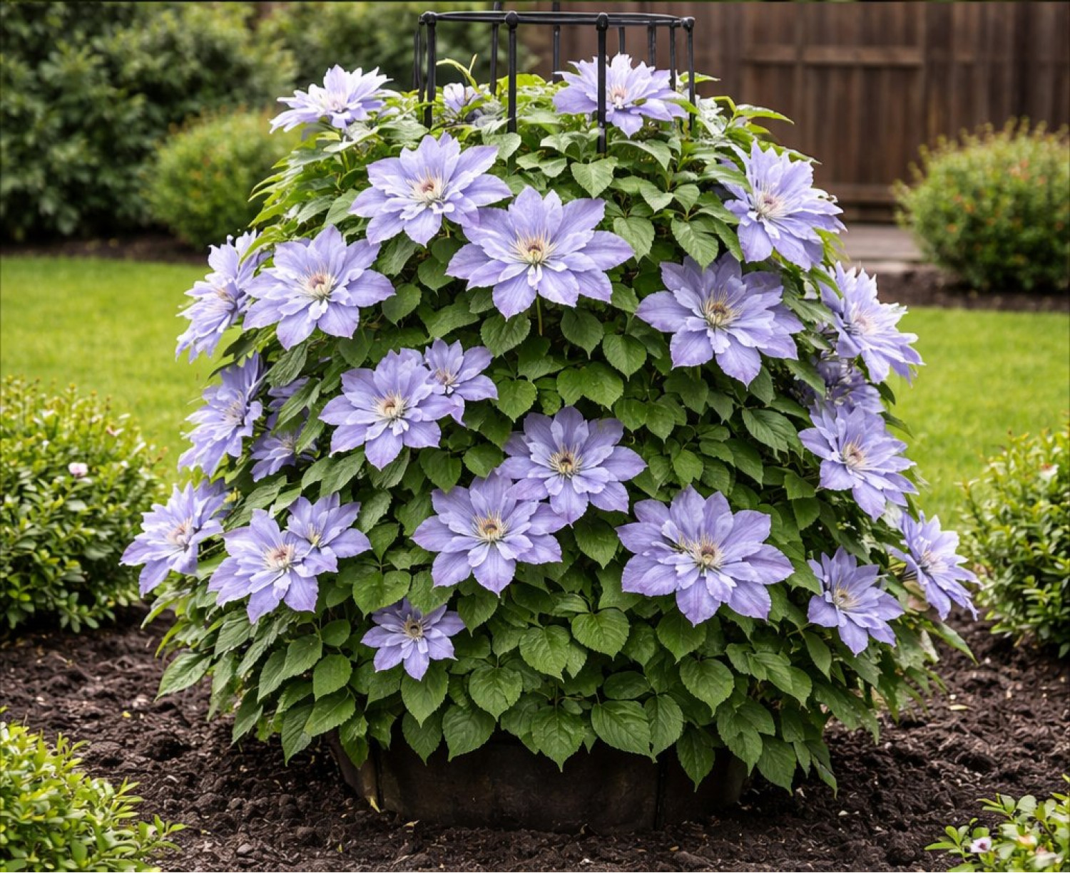 🌱 Период цветения очень обильный и продолжительный: с июня по август. Размер цветка в диаметре составляет 10–15 см. Аромат цветов почти неуловим. 🪴 Сорт предпочитает солнечные или слегка затененные участки, защищенные от ветра. Клематис Blekitny Aniol относится к 3-й группе обрезки (сильная), отличается исключительной морозостойкостью и устойчивостью к заболеваниям, что делает его идеальным для начинающих.