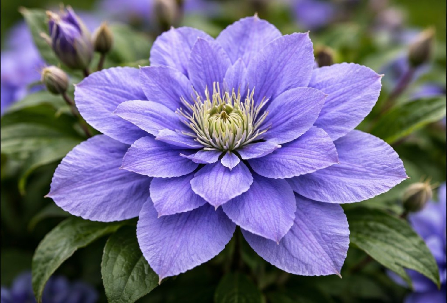 🌸 Клематис Blue Diamond — это изысканный сорт голландской селекции, который относится к группе крупноцветковых ранних клематисов. Главной особенностью растения являются его широко раскрытые цветы небесно-голубого или лавандового оттенка с красивыми текстурными прожилками на лепестках. По типу цветок простой, состоит из 6–8 заостренных лепестков с элегантно волнистыми краями и контрастным пучком светло-желтых тычинок в центре. 🌱 Куст компактный, достигает высоты 1.5–2 метра, что делает его отличным выбором для небольших садов и выращивания в контейнерах на террасах.