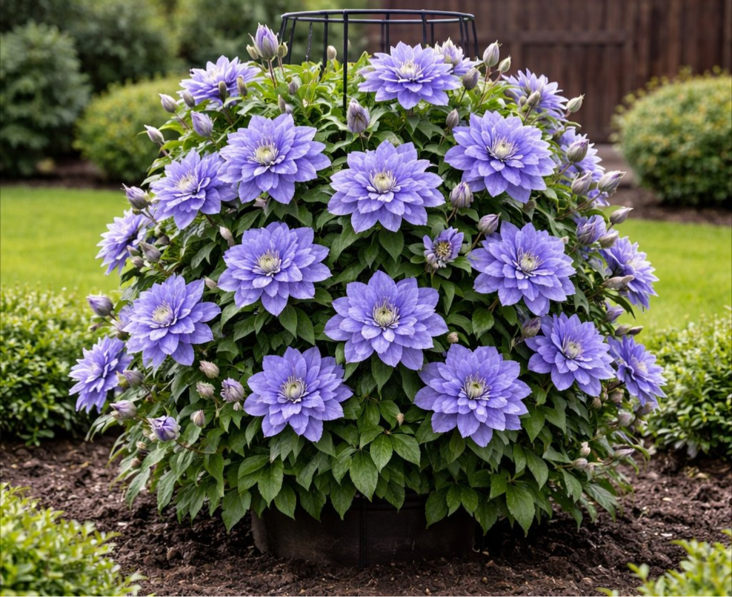 🌱 Период цветения проходит в два этапа: первый раз растение обильно зацветает в мае–июне на побегах прошлого года, второй раз — в августе–сентябре на побегах текущего года. Размер цветка составляет 10–15 см в диаметре. Аромат цветов легкий, едва уловимый. 🪴 Сорт предпочитает солнечные, но не жаркие места, так как на ярком солнце цветы могут быстрее выгорать. Клематис Blue Diamond относится ко 2-й группе обрезки (слабая) и обладает высокой морозостойкостью.