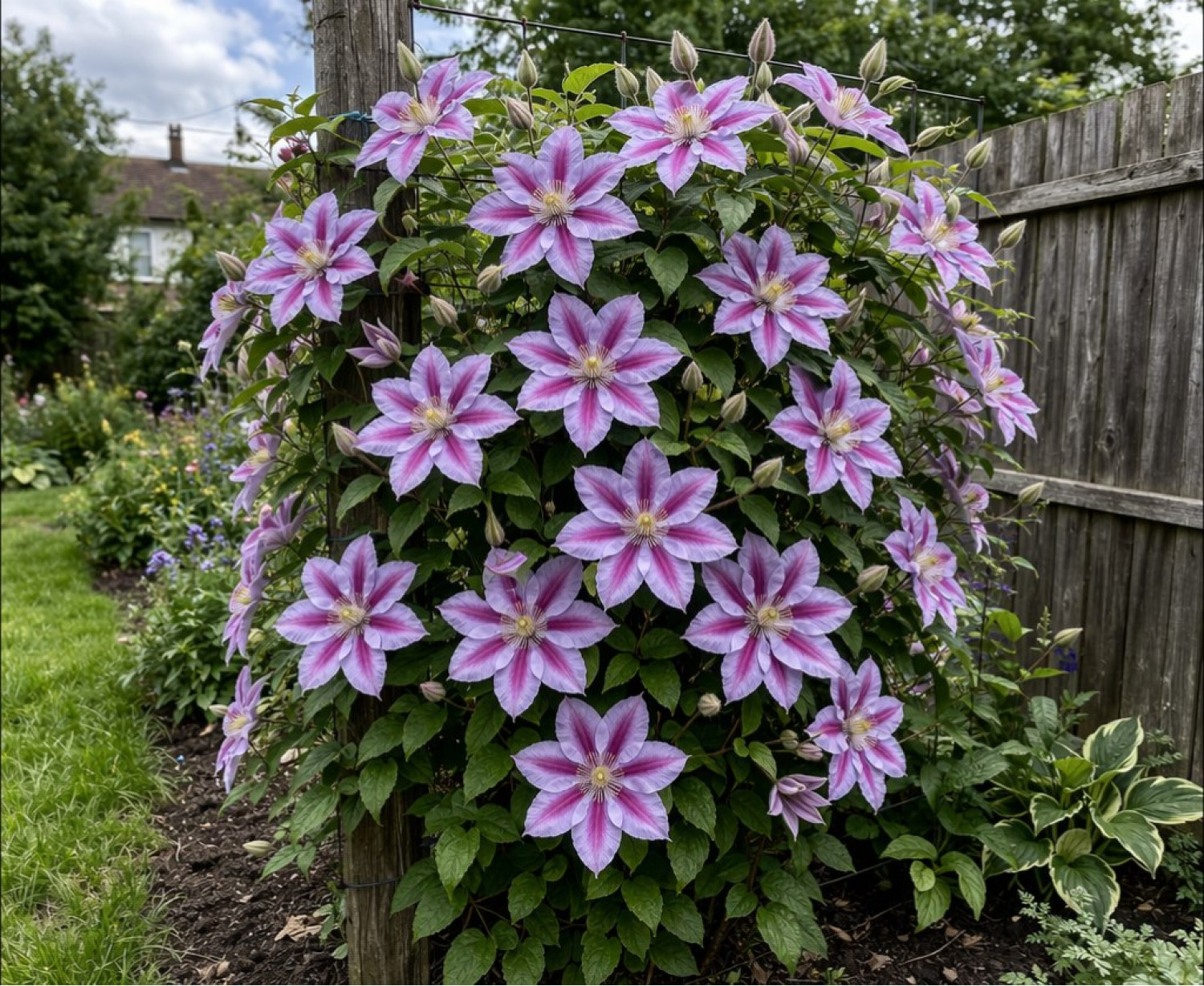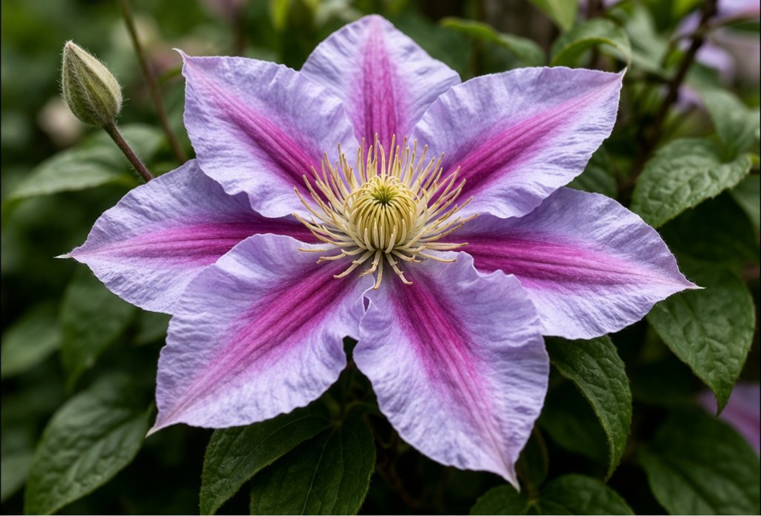 🌸 Клематис Capitaine Thuilleaux — это утонченный французский сорт, который относится к группе крупноцветковых ранних клематисов. Главной особенностью растения является его эффектный двухцветный окрас: на светло-розовом или кремовом фоне лепестков проходит широкая ярко-малиновая полоса по центру. По типу цветок простой, состоит из восьми крупных лепестков с волнистыми краями, окружающих центр с темно-красными тычинками. 🌱 Куст компактный, достигает высоты 2–3 метра, идеально подходит для вертикального озеленения беседок и решеток.