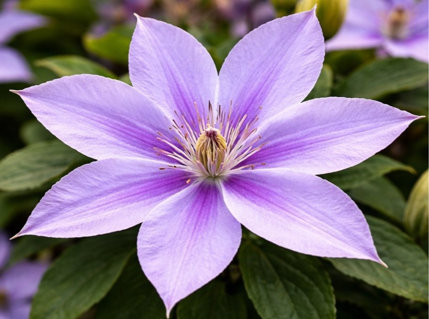🌸 Клематис Dorothy Walton — это старинный и надежный сорт французской селекции, известный также под синонимом Bagatelle. Он относится к группе крупноцветковых поздних клематисов. Главной особенностью растения являются его многочисленные, изящные цветки лилово-розового или серебристо-сиреневого оттенка с более темной полосой по центру лепестка. По типу цветок простой, звездообразный, состоит из 4-8 заостренных лепестков с волнистыми краями и кофейно-коричневыми тычинками в центре. 🌱 Куст представляет собой сильную листопадную лиану, достигающую высоты 2.5–3 метра, которая цепляется за опоры с помощью скрученных черешков.
