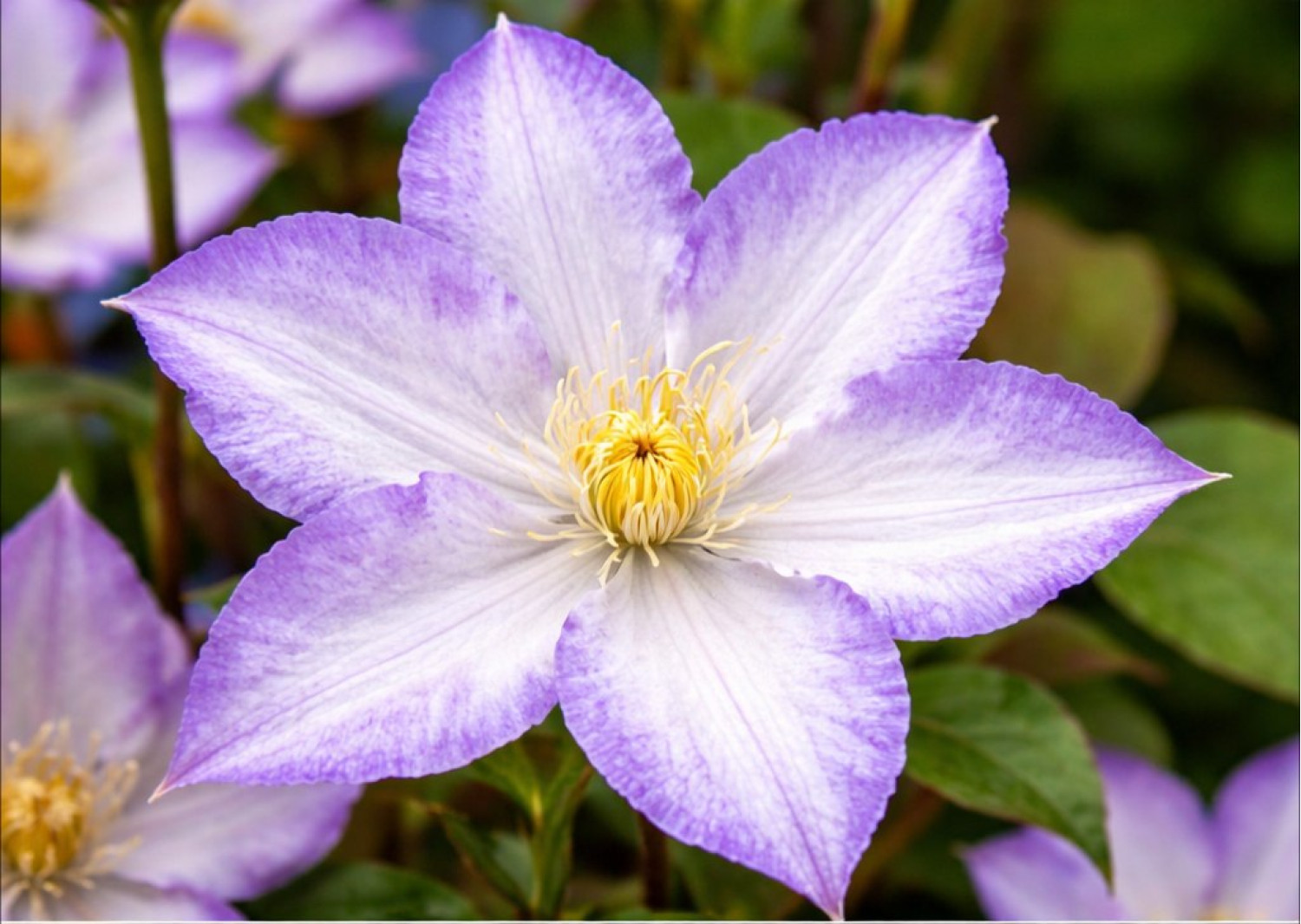 🌸 Клематис Lucky Charm — это эффектный и очень выносливый сорт голландской селекции, который относится к группе Viticella (фиолетовые). Главной особенностью растения является его нарядный окрас: белые лепестки обрамлены широкой фиолетово-сиреневой каймой, которая создает яркий и свежий контраст. По типу цветок простой, четырехпелюстковый, с красиво загнутыми краями и зелеными тычинками в центре. 🌱 Лиана обладает большой силой роста, достигая высоты 2.5–3 метра, и быстро образует плотный цветущий каскад на сетках, заборах и перголах.