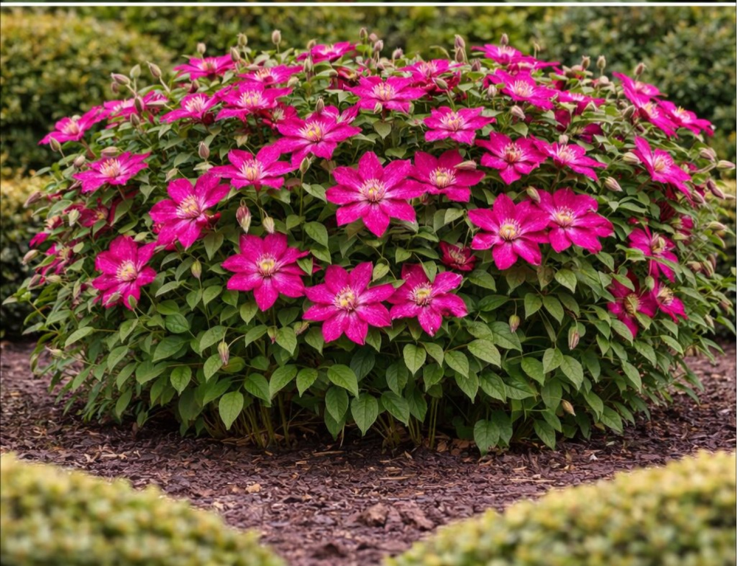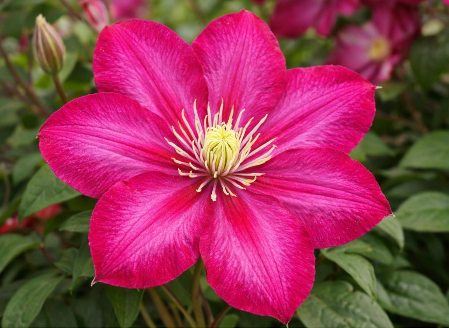 🌸 Клематис Ville de Lyon — это яркий крупноцветковый сорт, привлекающий насыщенной пурпурно-красной окраской цветков. Крупные и эффектные цветы формируют декоративные соцветия, а контрастные светлые тычинки подчёркивают насыщенность цвета и выразительность растения. 🌱 Куст обладает сильной силой роста и достигает высоты 2–3 метров, формируя пышную, обильно цветущую лиану, которая идеально подходит для украшения арок, пергол и заборов.