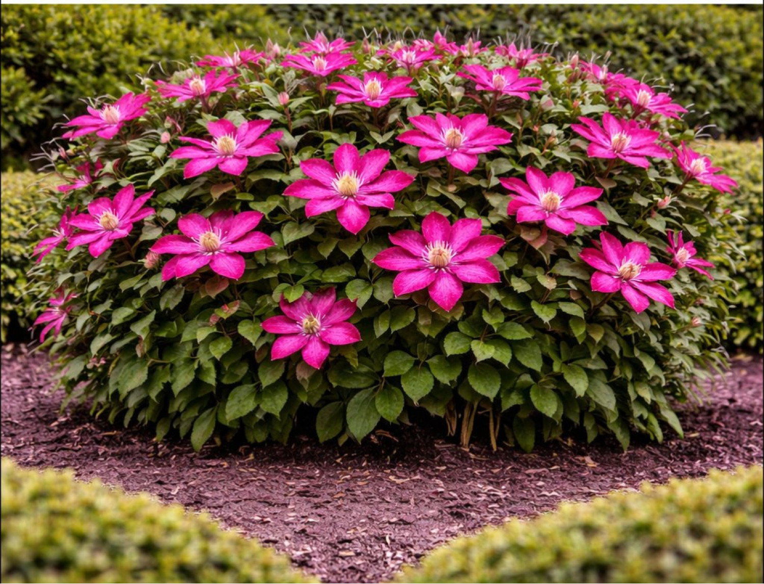 🌱 Период цветения продолжительный: с июня по август. Диаметр цветка составляет примерно 12–15 см. Аромат у цветов слабый или практически отсутствует. 🪴 Сорт предпочитает солнечные или слегка притенённые участки, защищённые от ветра. Клематис Vino относится к 3-й группе обрезки (сильной), отличается морозостойкостью и неприхотливостью в уходе.