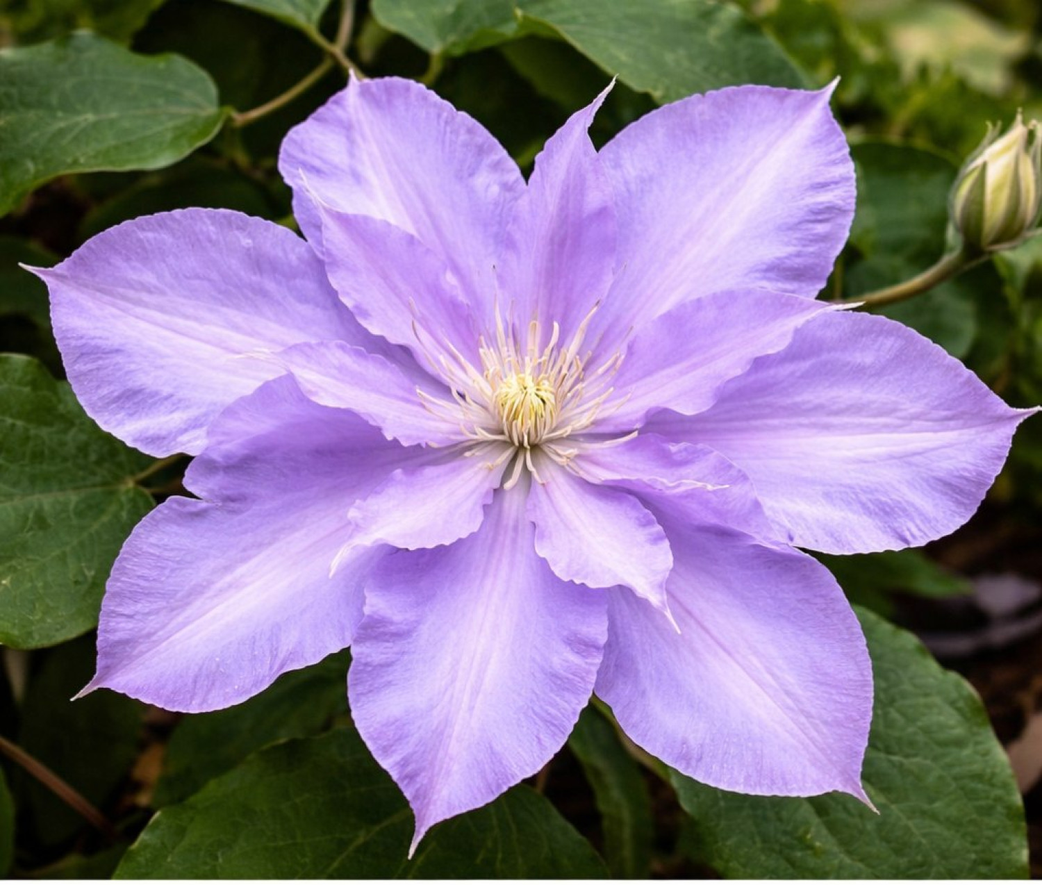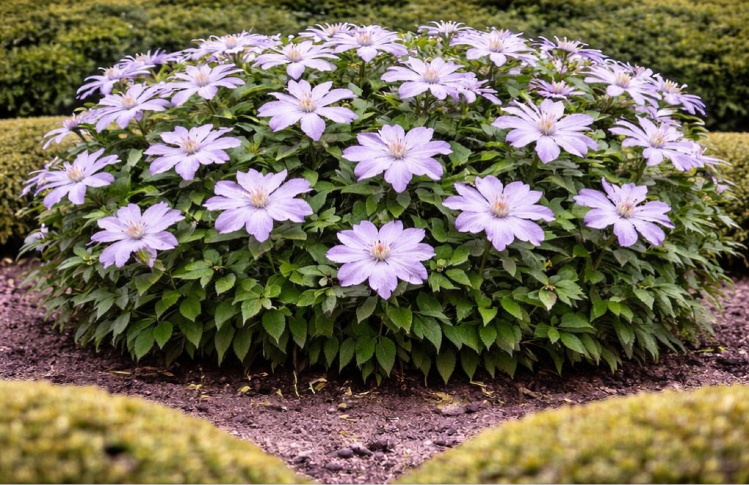 🌱 Период цветения продолжительный: с июня по август. Диаметр цветка около 12–15 см. Аромат у цветов слабый или практически отсутствует. 🪴 Сорт предпочитает солнечные или слегка притенённые участки, защищённые от ветра. Клематис Yvette Houry относится к 3-й группе обрезки (сильной), отличается морозостойкостью и неприхотливостью в уходе.