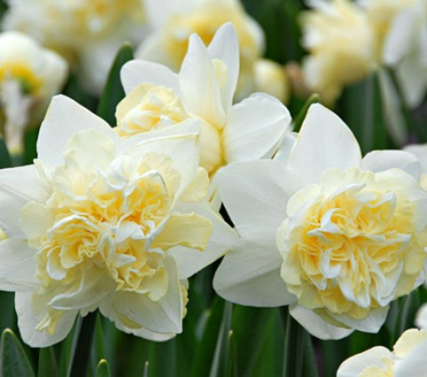 Этот сорт вырастает до 30-50 см в высоту и до 10-20 см в ширину. Цветы махровые: имеют дополнительные лепестки или махровую коронку, а иногда и то, и другое. Этот эффект делает их очень интересными! Лепестки широкие, с округлыми концами, окрашены в белый цвет. Коронка гофрированная, с выростами золотисто-желтого цвета. Цветки расположены горизонтально. Они ароматные — выделяют приятный сладкий запах. Листья синезеленого цвета. Каждое цветоносное стебло дает 3 или 4 эффектных цветка.