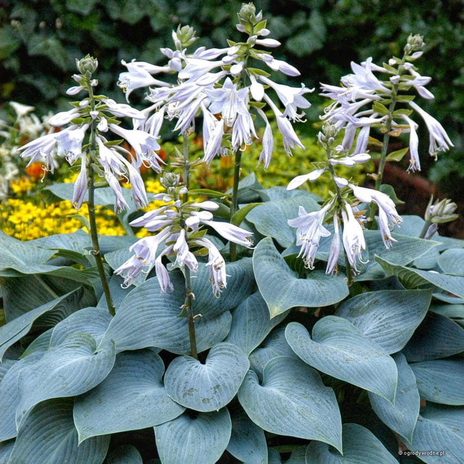 🌱 Кущ досягає висоти 40–45 см і ширини до 90 см, утворюючи акуратну кулясту форму. Період цвітіння припадає на липень, коли над густим листям піднімаються квітконоси з лавандовими дзвоновими квітами розміром близько 3 см. Аромат квітів легкий, майже невловимий. 🪴 Найкраще почувається в півтіні або тіні, де її блакитний відтінок зберігається максимально довго. Сорт чудово зимує і не потребує складного догляду.