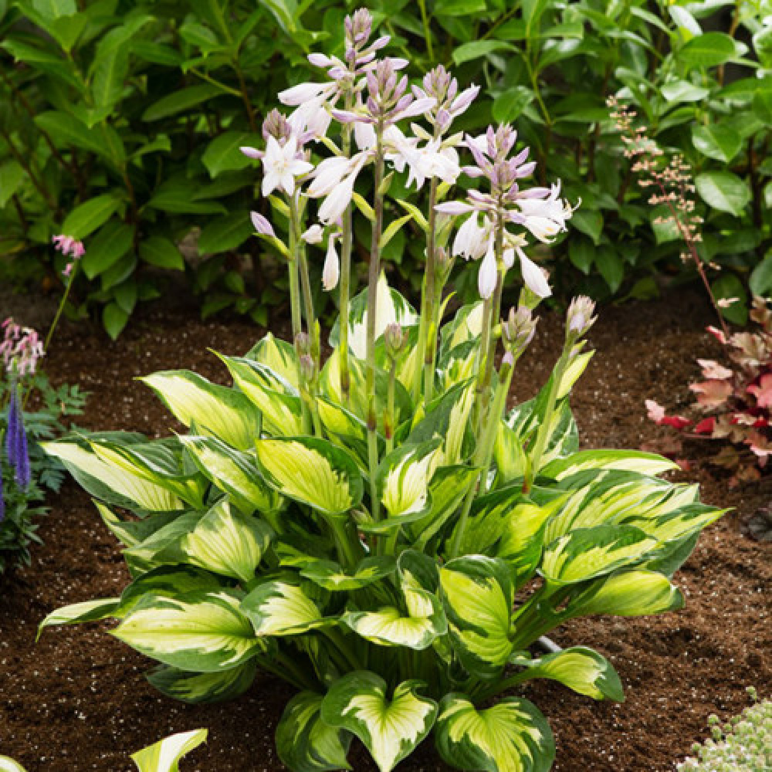 🌱 Кущ середнього розміру, висотою до 40–45 см і шириною до 60–70 см. Період цвітіння припадає на липень–серпень, коли над контрастним листям з'являються світло-лавандові трубчасті квіти розміром близько 3–4 см. Аромат квітів ніжний, ледь відчутний. 🪴 Найкраще почувається в півтіні, де зберігається яскравий контраст між центром та краєм листка. Сорт відрізняється стійкістю до шкідників, чудово зимує та не потребує особливого догляду.