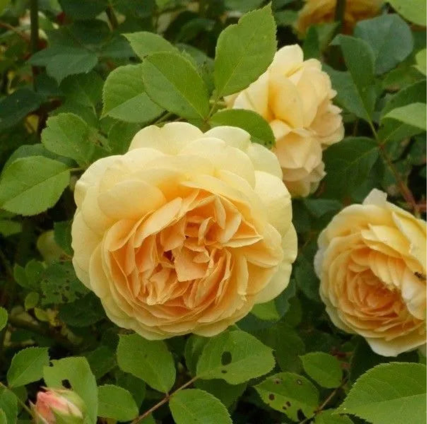 🌱Ця троянда має унікальне, тепле забарвлення, яке привертає погляд. Внутрішні пелюстки насиченого, глибокого золотисто-жовтого кольору, а зовнішні — блідо-жовті, кремові або кольору слонової кістки. Квітки великі, діаметром приблизно 10-12 см, густомахрові, чашоподібної або розетковидної форми, злегка пониклі під власною вагою. Вони з'являються в невеликих суцвіттях.