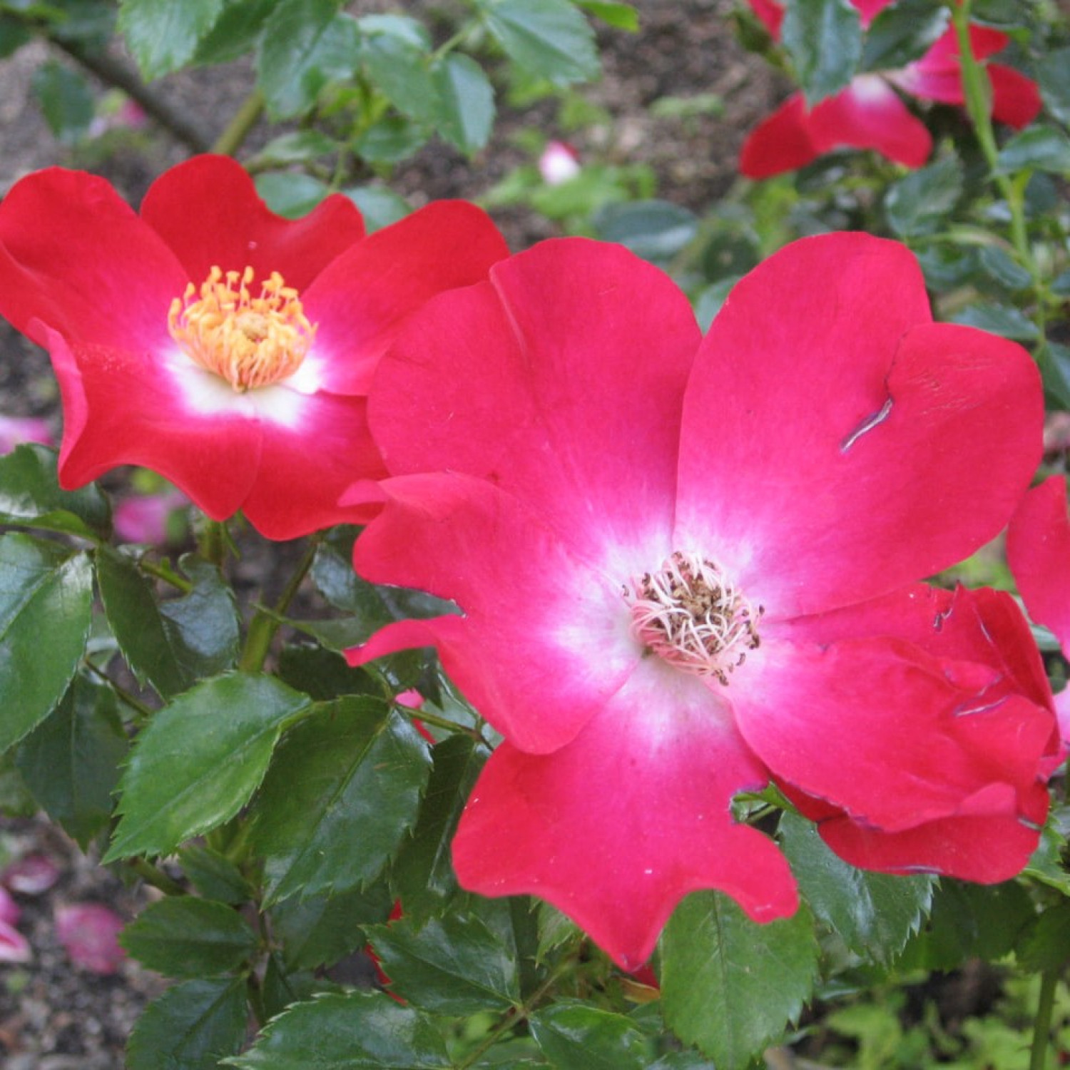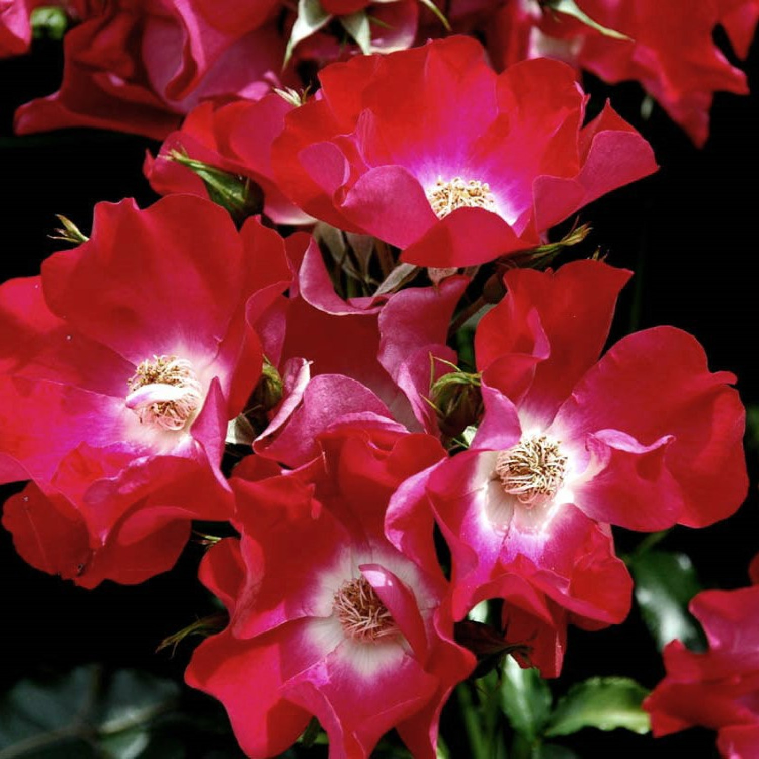 🌱Ця троянда має насичений яскраво-малиновий або вишнево-червоний колір з великим, контрастним білим або кремовим «вічком» (серединкою) та пучком яскраво-жовтих тичинок у центрі. Квітки немахрові, з хвилястими пелюстками (зазвичай 4–8 пелюсток), але дуже великі. Вони зібрані у великі китицеподібні суцвіття, до 10 штук у кожній кисті. Діаметр повністю розкритої троянди становить приблизно 9-11 см. Аромат у цього сорту легкий або слабкий.