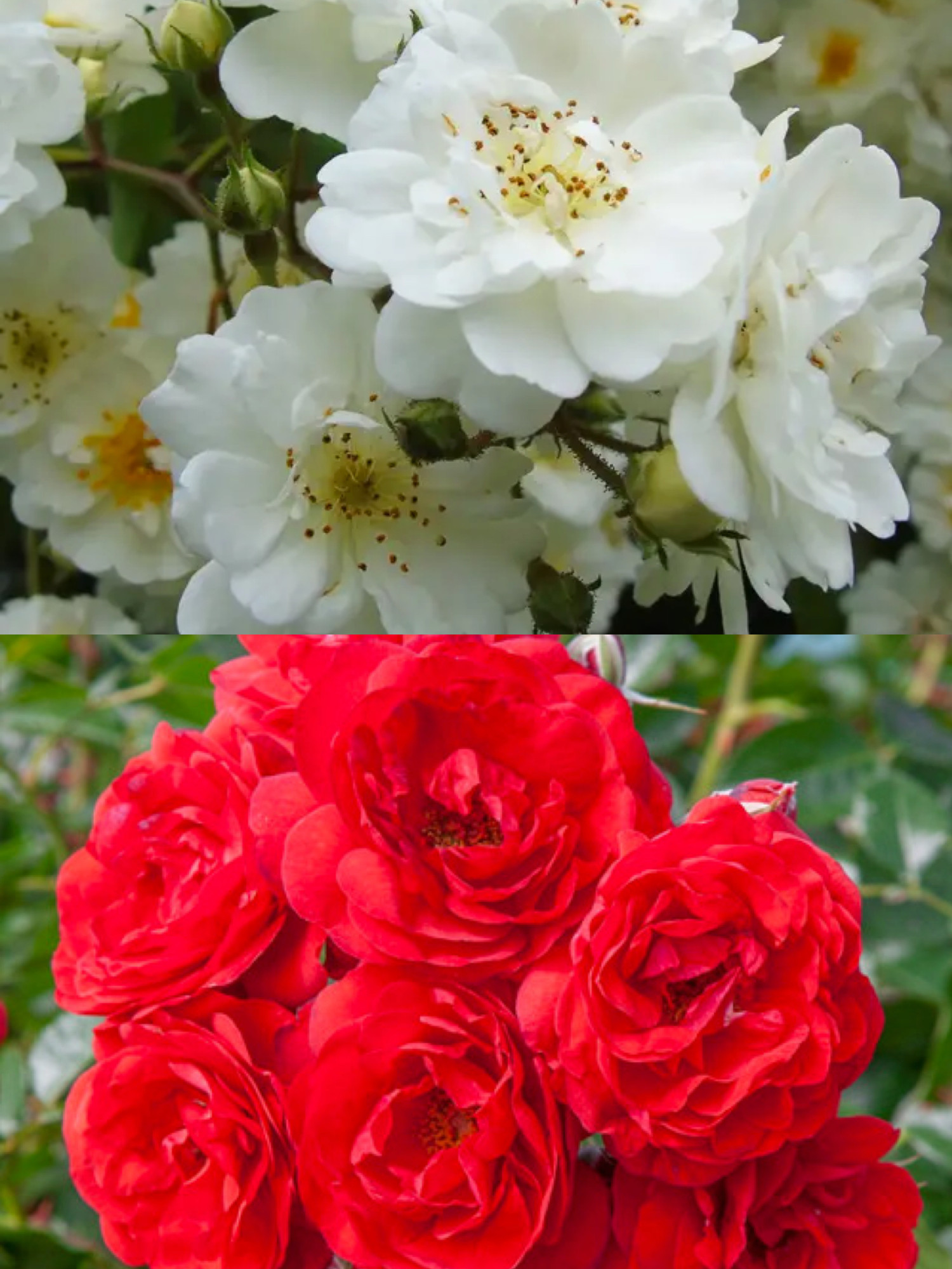 🌱 Разом вони утворюють справжню гру світла й кольору: білий водоспад ніжності переплітається з яскравими червоними акцентами. Крона штамба виглядає об’ємно, ошатно й дуже декоративно в будь-якій зоні саду. Ми є виробником саджанців, тому гарантуємо здорові пагони, сильну кореневу систему та високу якість кожної рослини.