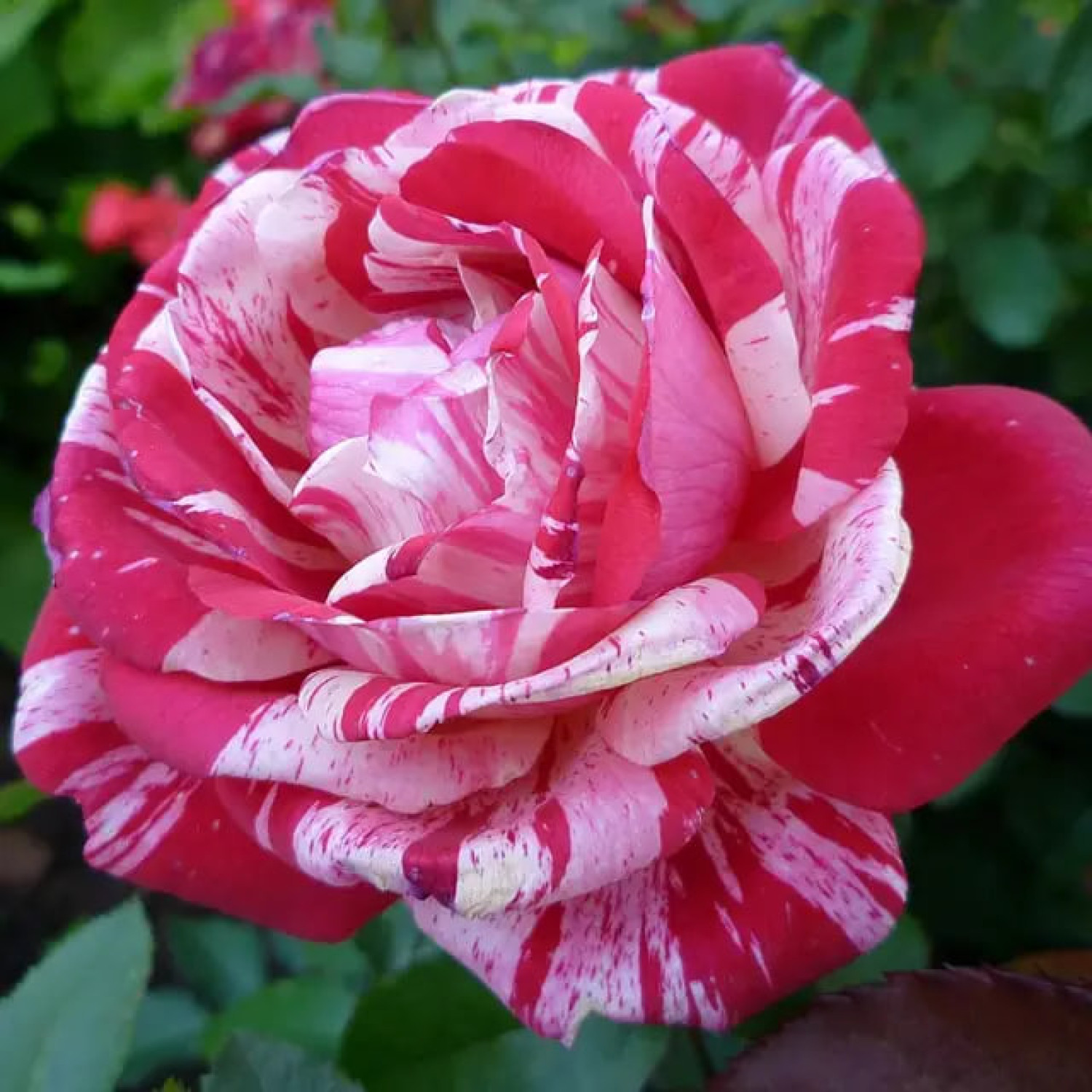 🌹Троянда «Пістрява Фантазія» — це унікальний український сорт чайно-гібридної троянди, який є справжньою перлиною колекції Нікітського ботанічного саду. Сорт був виведений селекціонерами К. І. Зиковим та З. К. Клименко у 1977 році, а його батьківським сортом була відома троянда 'Kronenbourg'. Ця троянда створює сильний візуальний акцент завдяки своєму незвичайному біколорному забарвленню. Пелюстки насиченого малинового кольору з білими або кремовими смугами та вставками, а зворотний бік часто має жовтуватий відтінок. Малюнок на кожній квітці унікальний та неповторний.