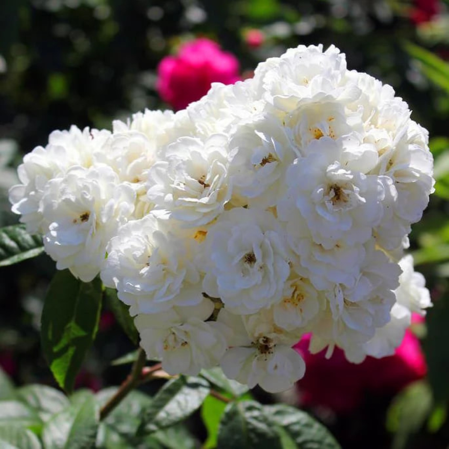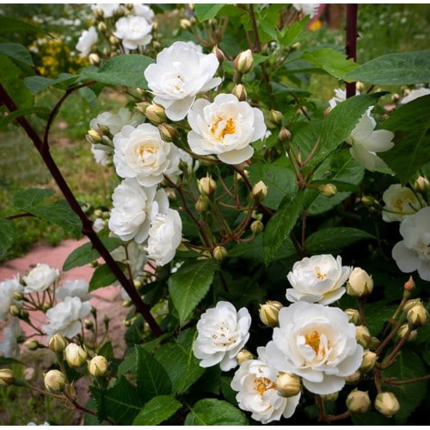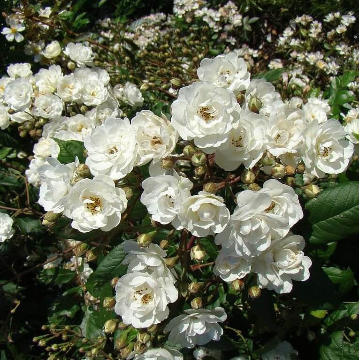 🌿Квітки невеликі, напівмахрові (близько 15-20 пелюсток), чашоподібної або плоскої форми, з помітними золотистими тичинками в центрі. Вони зібрані в дуже великі, щільні суцвіття-кисті, що повністю покривають кущ під час цвітіння. Діаметр квітки зазвичай становить приблизно 4-6 см. Аромат у цього сорту легкий, тонкий, приємний.
