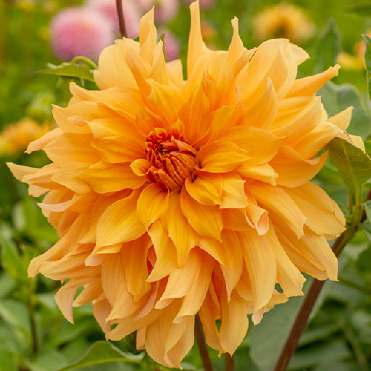 🌺 Жоржина Big Brother (Біг Бразер) — величний сорт групи декоративних жоржин (Dinnerplate), який вражає своїми гігантськими розмірами та теплим сонячним забарвленням! 🌱 Сорт формує потужний кущ висотою 90–120 см. Головною особливістю є неймовірно великі махрові суцвіття діаметром від 20 до 25 см (іноді до 30 см). Пелюстки мають складне та ніжне забарвлення: золотисто-жовта основа плавно переходить у теплі відтінки карамелі, абрикоса та світло-помаранчевого кольору, що створює ефект сяйва. Цвітіння рясне та тривале — з липня до перших заморозок. Міцні стебла добре тримають важкі квіти, проте через гігантський розмір суцвіть рослина може потребувати додаткової опори. Листя густе, темно-зелене, що чудово контрастує з яскравими бутонами.