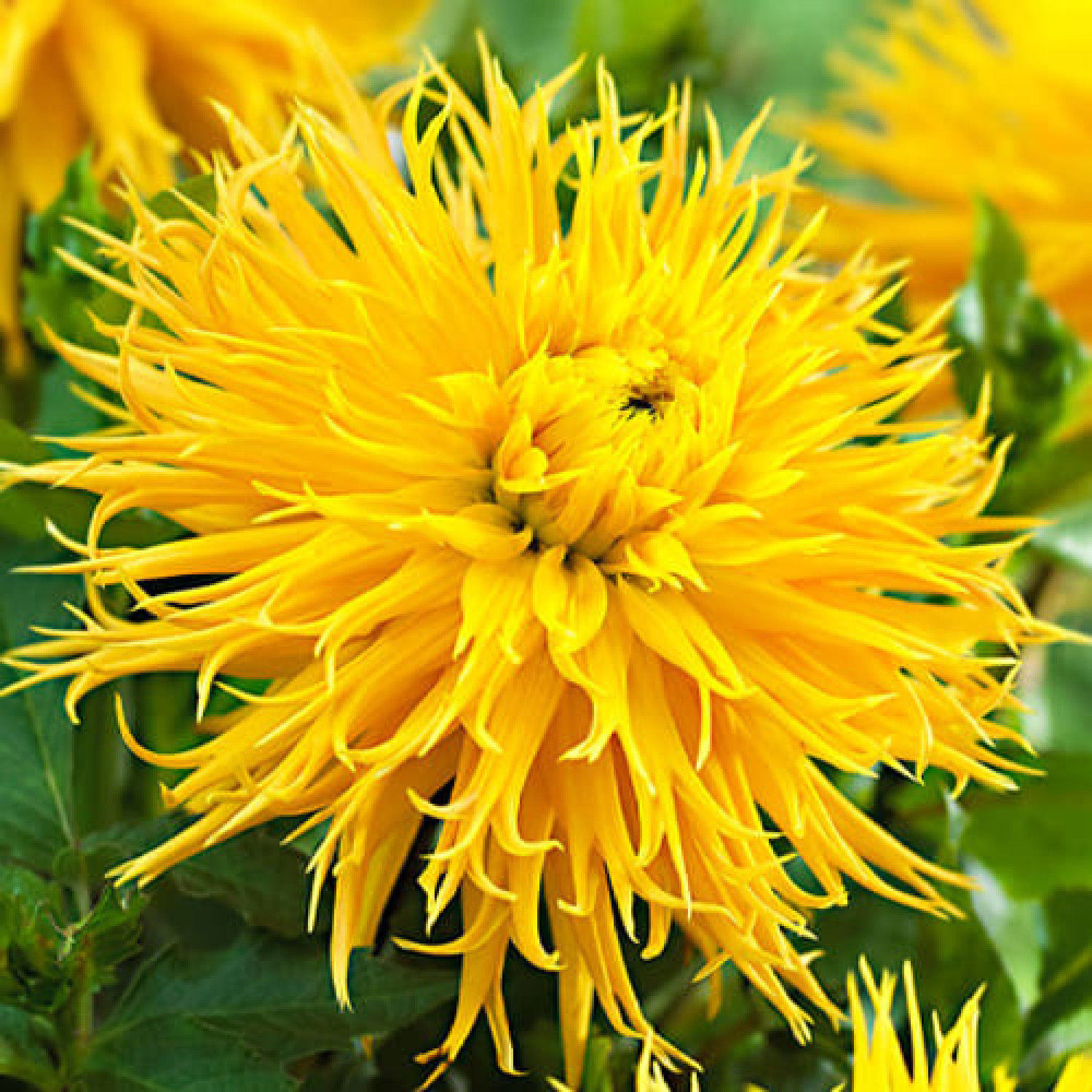 🌺 Жоржина Encore — справжній велетень серед кактусових жоржин, який вражає своїми масштабами та сонячним забарвленням! 🌱 Рослина потужна, заввишки 110–130 см, з міцними стеблами, що тримають величезні квіти. Суцвіття гігантські (Dinnerplate), діаметром до 25–30 см, складаються з численних вузьких, злегка скручених пелюсток-променів. Колір — насичений лимонно-жовтий з ніжними вершковими відтінками на кінчиках, що створює ефект внутрішнього сяйва. Цвіте рясно з липня по жовтень. Через значну висоту та вагу квітів сорт обов’язково потребує надійної опори.