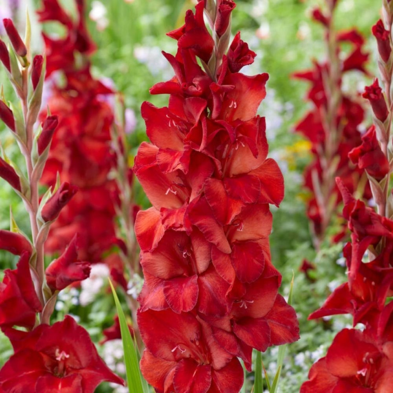 🌺 Гладіолус Amiga — яскравий та життєрадісний сорт, який додасть вашому саду насичених барв та енергії! 🌱 Рослина досягає висоти 100–120 см, має міцне мечоподібне листя та стійкі квітконоси. Квіти великі, діаметром близько 12–15 см, мають глибоке оксамитове забарвлення насиченого червоно-пурпурового або бордового кольору з витонченою світлою облямівкою на пелюстках. Колосоподібне суцвіття густе, квіти розпускаються поступово, забезпечуючи тривале цвітіння з липня по вересень.
