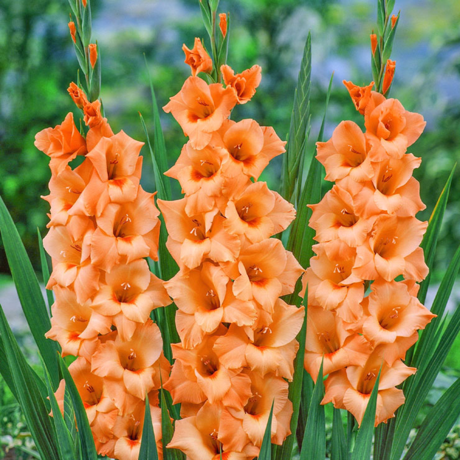 🌺 Гладіолус Peter Pears — справжня легенда серед гладіолусів, яка цінується садівниками за свій неймовірно теплий та сонячний колір! 🌱 Рослина потужна, досягає висоти 100–120 см, формуючи міцні квітконоси з мечоподібним листям. Квіти великі, діаметром 12–15 см, мають дуже привабливе забарвлення: насичений абрикосово-оранжевий або лососевий відтінок із яскравою червоно-помаранчевою плямою в центрі. Пелюстки злегка гофровані, що додає суцвіттям пишності. Квіти зібрані у довге, щільне колосоподібне суцвіття довжиною до 50 см. Цвітіння триває поступово з липня по вересень.
