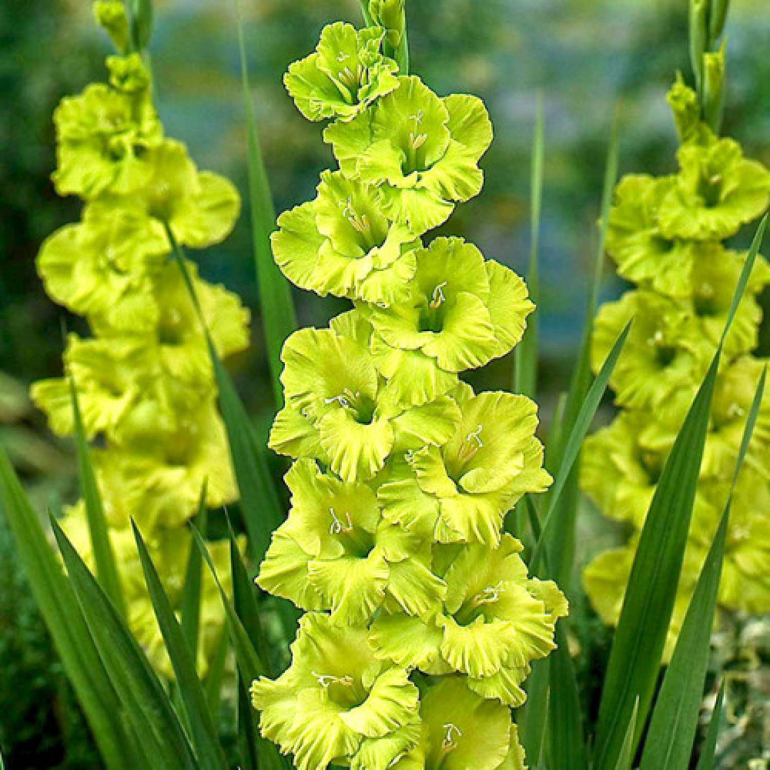 🌺 Гладіолус Prima Verde — екзотичний та неймовірно свіжий сорт, який привертає увагу своїм рідкісним забарвленням! 🌱 Рослина досягає висоти 100–120 см і формує міцні квітконоси. Головна особливість сорту — великі квітки діаметром 12–15 см ніжного лимонно-салатового або яблучно-зеленого кольору. Пелюстки мають виразну гофрованість по краях, що додає суцвіттям особливої легкості та об'єму. Квіти зібрані у довге, щільне колосоподібне суцвіття, яке розпускається поступово знизу вгору. Період цвітіння триває з липня по вересень.