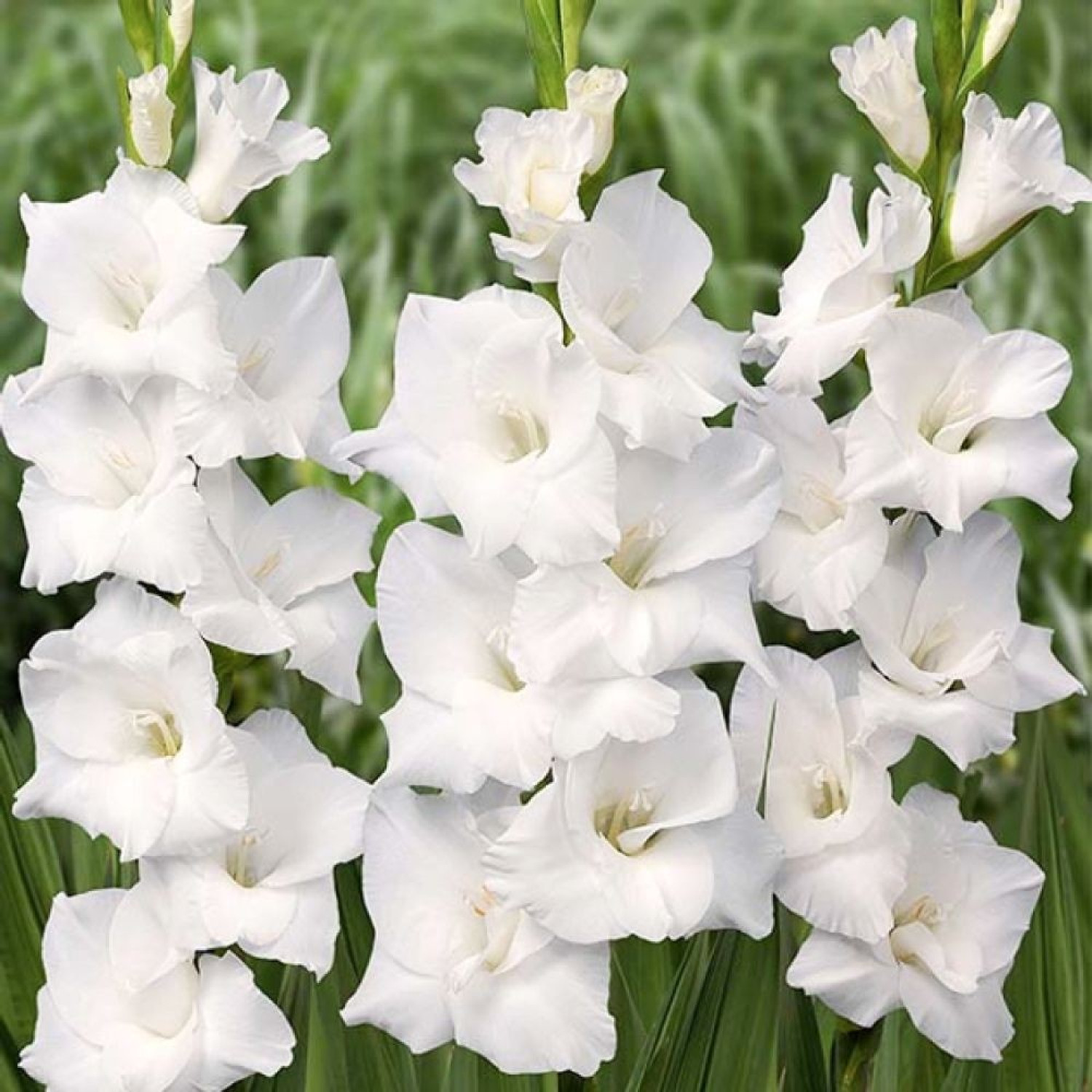 🪴 Гладіолус Snowdon — ідеальний вибір для створення «білих садів» та елегантних вертикальних акцентів. Це фаворит для весільної флористики: букети з цим сортом виглядають надзвичайно урочисто та шляхетно. Найкраще виглядає в групових посадках по 10–15 цибулин на фоні темної зелені або в поєднанні з контрастними темними сортами.