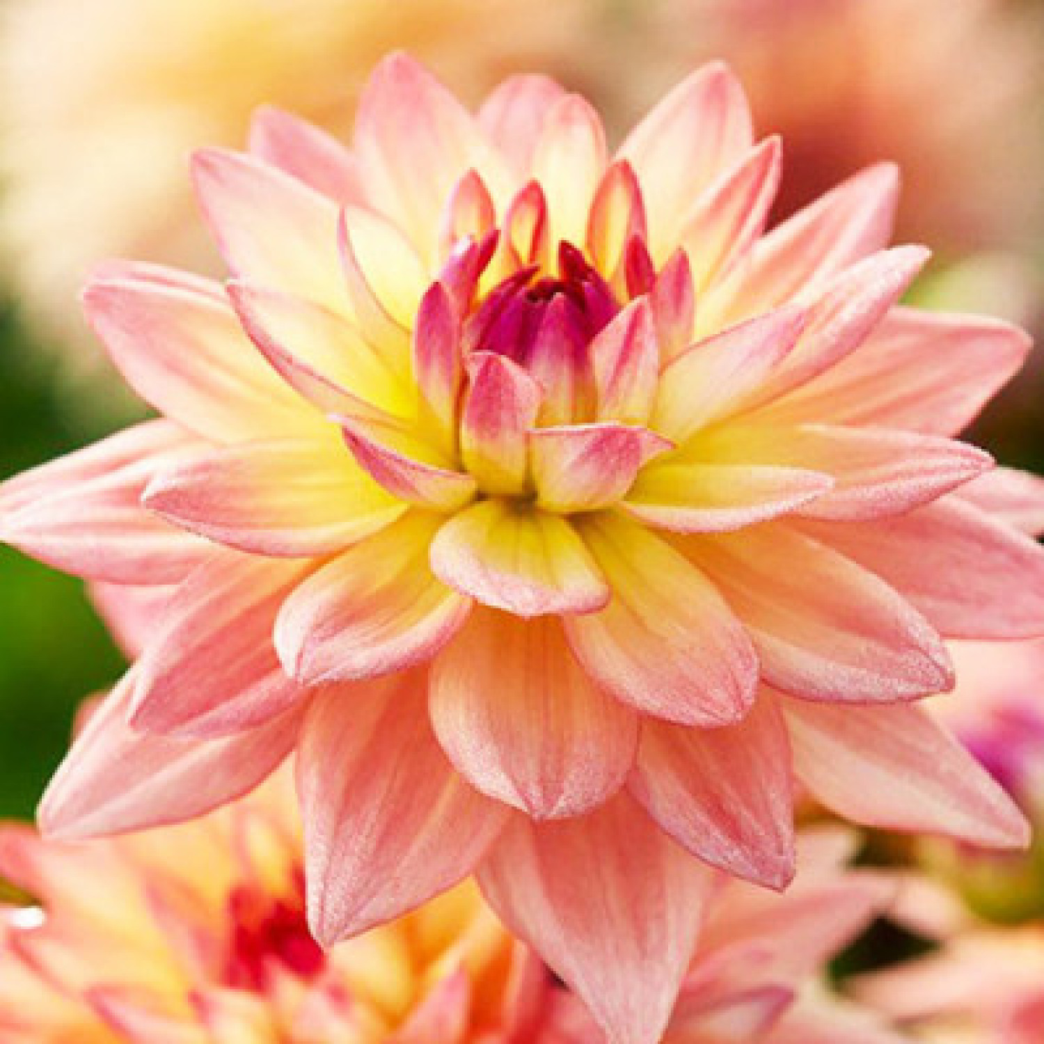 🌺 Жоржина Melody Dora — чарівний низькорослий сорт із відомої серії «Melody», що ідеально підходить для прикрашання переднього плану бордюрів та вирощування у контейнерах! 🌱 Рослина компактна, заввишки 50–60 см, формує охайний кущ, який з липня по жовтень вкривається численними квітами. Суцвіття декоративного типу, діаметром 10–12 см, мають дивовижне забарвлення: ніжні лососево-рожеві пелюстки з теплим жовтим центром створюють ефект м'якого сонячного сяйва. Сорт вирізняється тривалим цвітінням та стійкістю до несприятливих погодних умов.