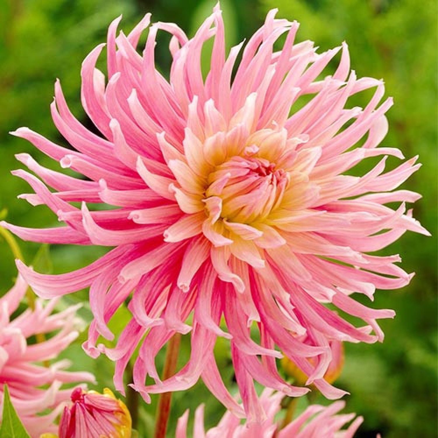 🌺 Жоржина Star's Favourite — вишуканий представник кактусових жоржин, що підкорює серця своїм ніжним, «зефірним» виглядом! 🌱 Рослина досягає висоти 100–110 см і формує міцний кущ із насиченим зеленим листям. Суцвіття великі, діаметром 15–20 см, мають характерні вузькі пелюстки-голки, що злегка вигинаються до центру. Забарвлення неймовірно романтичне: світло-рожеві, майже пастельні пелюстки плавно переходять у кремово-білу серцевину, створюючи ефект м’якого світіння. Цвітіння дуже рясне та стабільне з липня до жовтня.