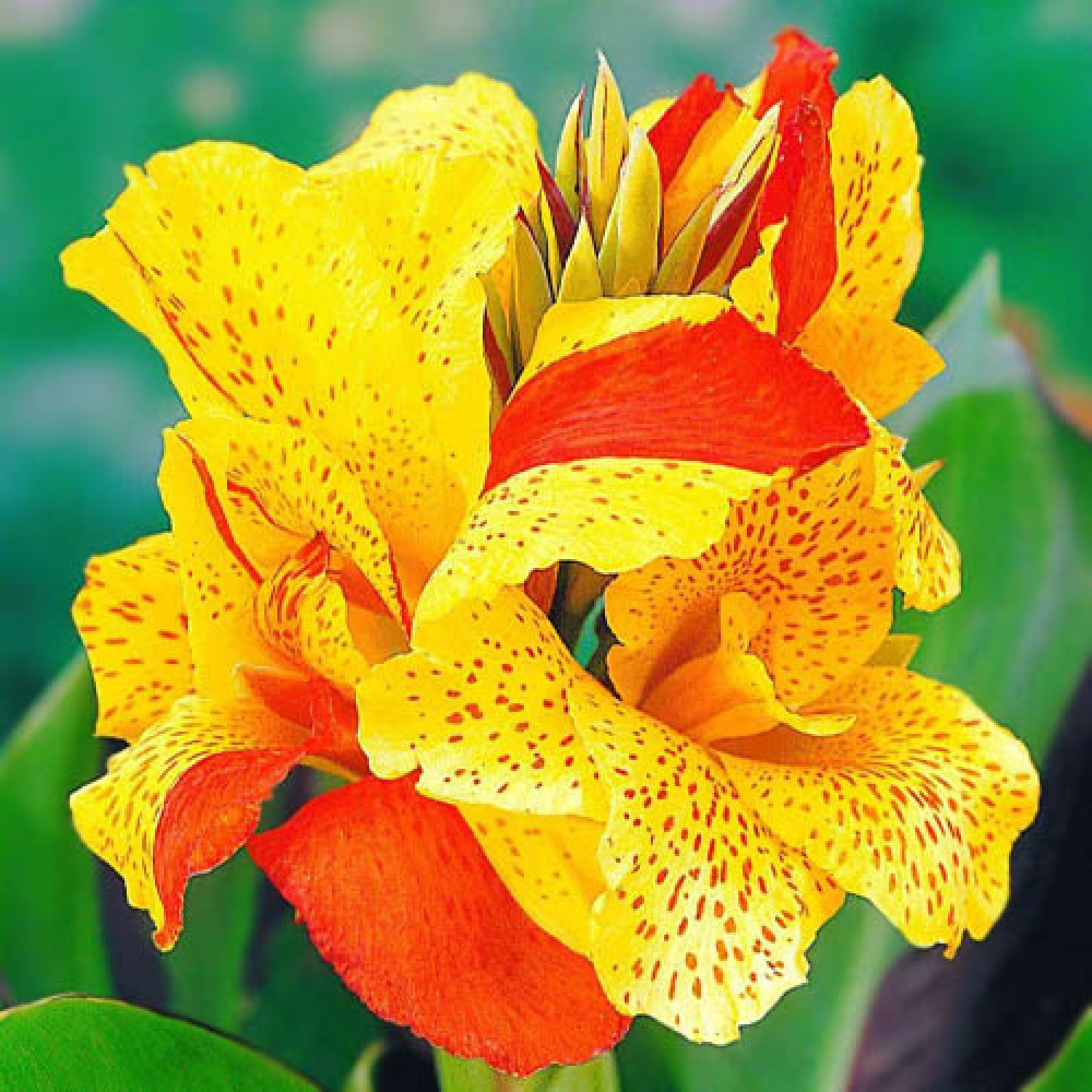 Канна Cleopatra — надзвичайно декоративний і оригінальний сорт, який одразу привертає увагу своїм контрастним забарвленням. Квіти двоколірні: поєднують насичений червоний та яскраво-жовтий кольори, інколи з плямами, що робить кожну квітку унікальною. Листя велике, декоративне, зелене з бордовими або бронзовими відтінками. Рослина виглядає дуже екзотично й ефектно протягом усього сезону. Цвітіння рясне та тривале — з початку літа до осені. Канна Cleopatra ідеально підходить для клумб, солітерних посадок і контейнерного вирощування, створюючи яскравий тропічний акцент у саду.
