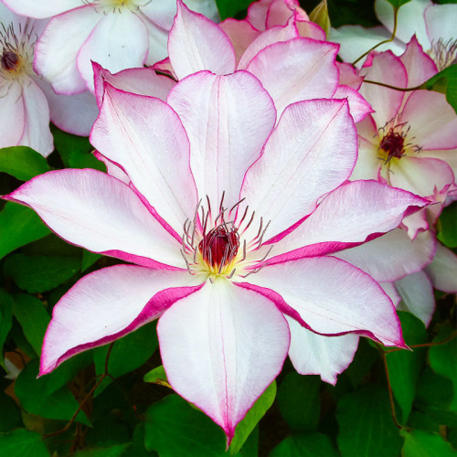 🌸 Клематис Omoshiro — витончений японський сорт великоквіткового клематису, який вирізняється ніжним та елегантним забарвленням квітів. Основний колір пелюсток світло-рожевий або майже білий, з тонкою рожево-лавандовою окантовкою по краю, яка з віком квітки стає більш виразною. Квітка проста, складається з 6–8 широких, злегка хвилястих пелюсток з кремово-жовтими тичинками, що надають їй особливої легкості та шарму. 🌱 Ліана має помірну силу росту та досягає висоти 2–3 метри, чудово підходить для вертикального озеленення арок, пергол, шпалер і декоративних опор.