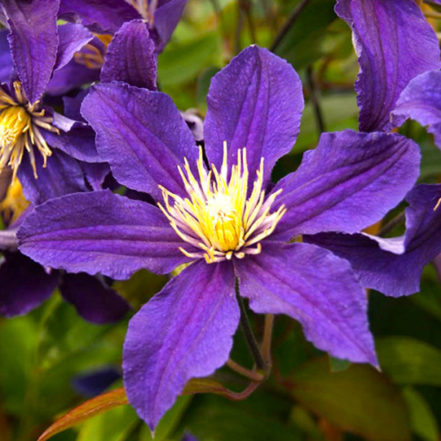 🌸 Клематис Hudson River — це чарівний сорт голландської селекції, який належить до групи Integrifolia (цілолисті). Головною особливістю рослини є її напівтрав'яниста форма: пагони не чіпляються за опори самостійно, тому їх можна використовувати як розкішний квітучий килим або підв'язувати до шпалери. За типом квітка проста, зіркоподібна, з витончено закрученими пелюстками. Забарвлення квітів дуже виразне — насичене синьо-фіолетове з темнішою смугою по центру та контрастними світлими тичинками. 🌱 Ліана компактна, досягає висоти 1.5–2 метри, що робить її ідеальною для невеликих садів та контейнерів.