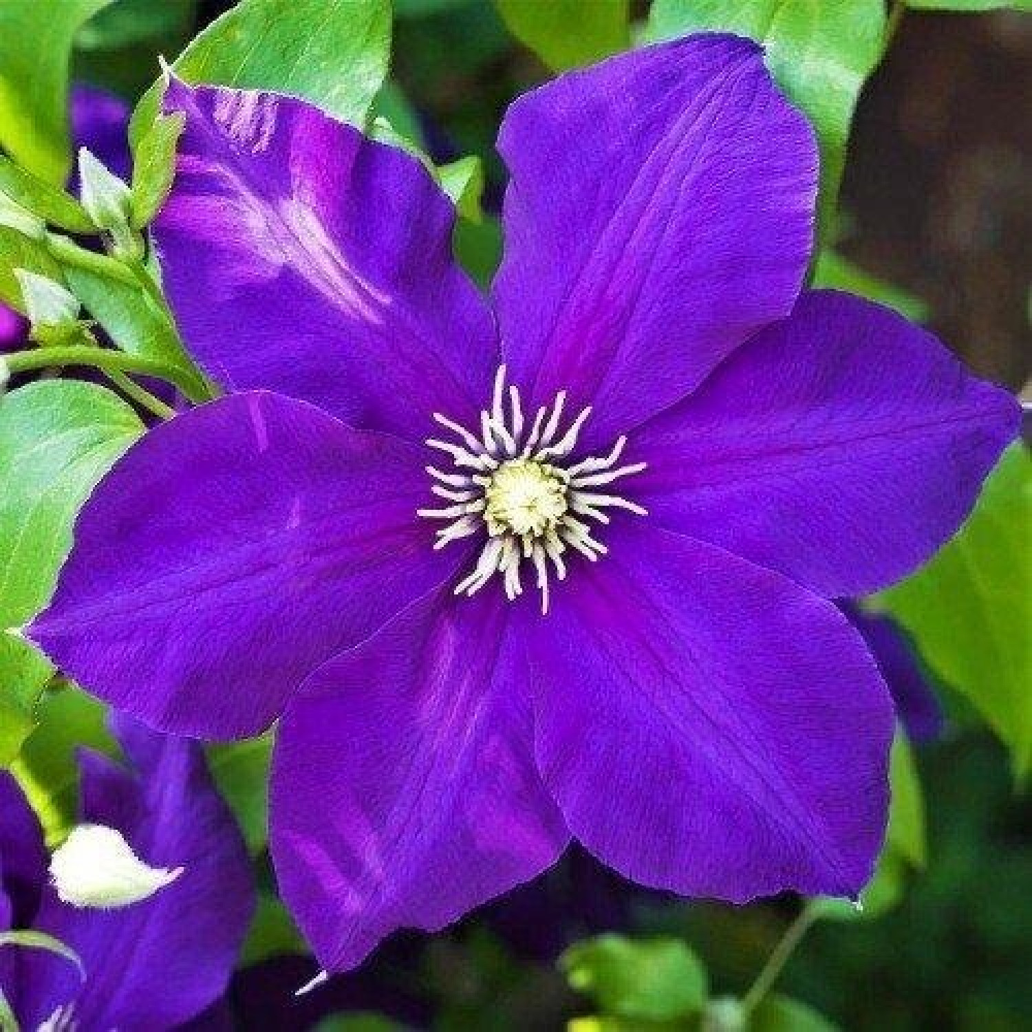 🌸 Клематис Jackmanii — це легендарний сорт, що став еталоном садових ліан, який належить до групи великоквіткових пізніх клематисів. Головною особливістю рослини є її фантастична рясність цвітіння: у пік сезону кущ перетворюється на суцільну стіну з глибоких темно-фіолетових квітів з оксамитовою текстурою. За типом квітка проста, зазвичай складається з 4–6 пелюсток із виразними світлими тичинками в центрі. 🌱 Ліана має виняткову силу росту, досягаючи висоти 3–4 метри, і здатна швидко задекорувати високі стіни, перголи або старі дерева.