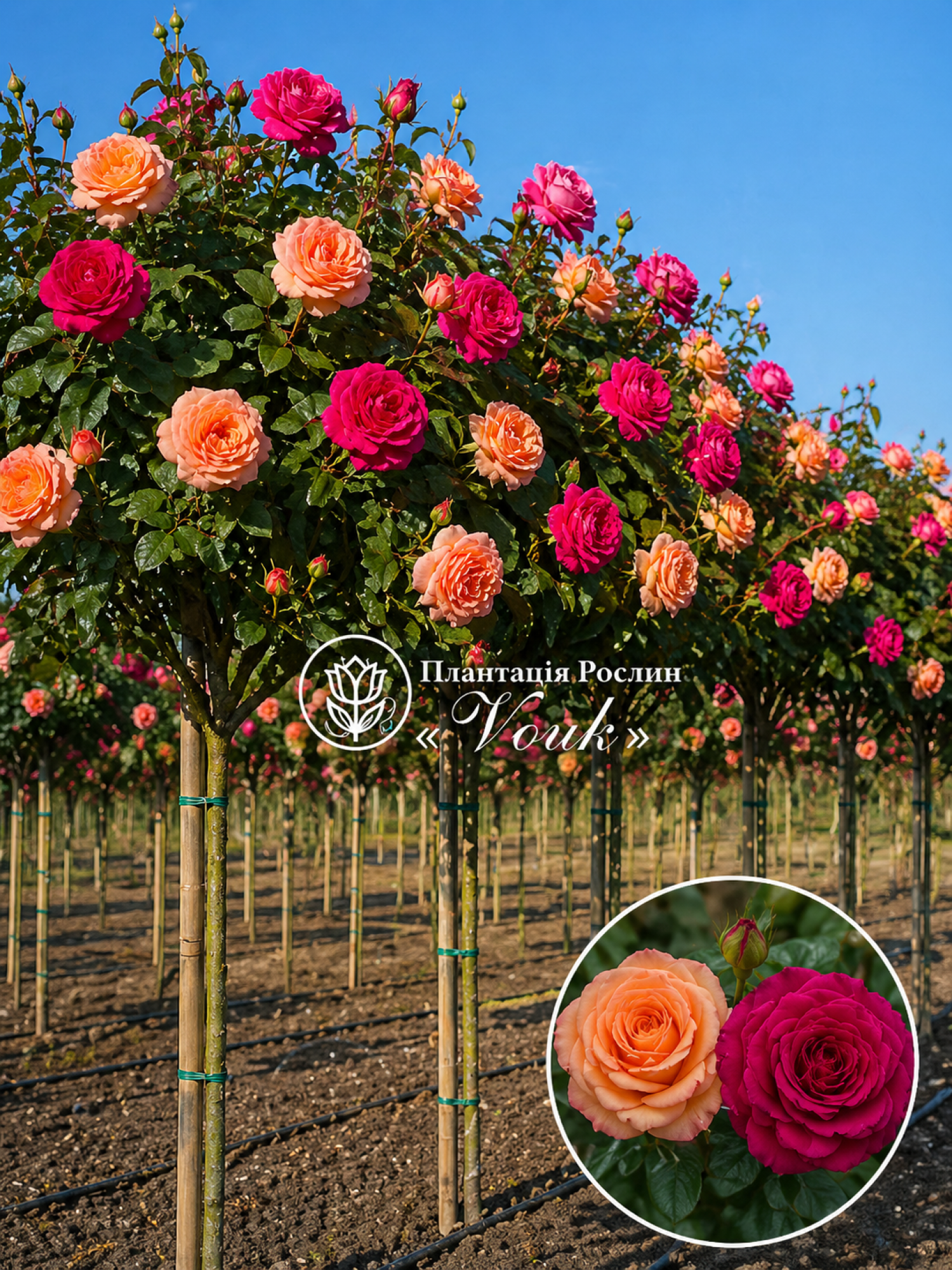 Троянда Юріанда / Мілва на штамбі – ефектне поєднання двох яскравих чайно-гібридних сортів на одному штамбі, яке створює розкішну декоративну композицію з контрастним та водночас гармонійним цвітінням. Висота рослини 120-160 см. Крона густа, велика, рівномірно сформована, рясно вкрита великими квітами та бутонами на різних стадіях розпуску. Листя темно-зелене, щільне, здорове, з глянцевим блиском, що чудово підкреслює насичені кольори квітів.